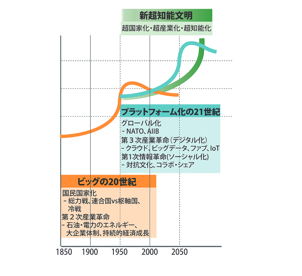 NIRAオピニオンNo.17 2015.07.21 プラットフォーム化の21世紀と新文明への兆し この記事は分で読めます シェア Tweet 公文俊平 多摩大学情報社会学研究所所長 概要 今日の世界はいまだに、大きな国家と大きな企業が強い影響力を持つ「ビッグの20世紀」の遺産の中にある。他方、「プラットフォーム化の21世紀」への転換と呼べるような、社会変化の波を見て取ることもできる。ユーザのエンパワメント(支援)を促進するプラットフォーム化の動きは、今世紀に入り政治、経済、社会の全ての側面で一斉に進展している。 この21世紀の新しい動きは20世紀の負の遺産を克服することに貢献しそうである。とりわけ社会面で生じている文化変容としての「ソーシャル化」が進展する中で、あらゆる人の利用できるコミュニケーション・プラットフォームが出現して、さまざまなソーシャルネットワーク・サービスが提供されていることは大きな希望である。 同時に、それにかぶさる形で、さらに抜本的な変化の波が押し寄せている。「超知能」の出現をもたらす情報化の波がそれである。ソーシャル化に端を発した情報化は、今や、政治・経済面だけでなく、人類の社会生活の全てを一変させる勢いで、加速的に進展している。それは、人類に新たな進化のチャンスをもたらすと同時に、人類史上最大のリスクも伴っている。われわれはこの挑戦の意味を深く理解し、的確な対処に全力をあげなくてはならない。 PDFで読む (1.6MB) INDEX 「ビッグの20世紀」と負の遺産 「プラットフォーム化の世紀」としての21世紀 国家化、産業化、ソーシャル化におけるプラットフォーム 「超知能化」が生みだす新文明 新文明の「事前適応」としての情報化 「ビッグの20世紀」と負の遺産 今世紀との対比のために、はじめに20世紀を国家化と産業化の両面から概観しておきたい。国家化の面では19世紀に誕生した国民国家は20世紀に入り、覇権の獲得を目指す「総力戦」を戦うようになった。「国民戦争」となった最初の世界戦争に続いて、第2次世界大戦では国民国家群が「連合国」と「枢軸国」に分かれて戦った。勝利した連合国側はさらに「自由民主主義陣営」と「共産主義陣営」に分裂したが、20世紀末には冷戦の終焉を迎える。と同時に世界の覇権を握った自由民主主義陣営のリーダー米国は「歴史の終わり」を宣言し、「平和の配当」への世界の期待が高まった。しかし、現実には、民族・地域・宗教紛争の対応に翻弄され、中国の経済的・軍事的台頭に気がついた米国は現在、外交の軸足を中東からアジアに移す「リバランス」政策をとり始めている。 産業化の面では19世紀から続く「第2次産業革命」の中で、石油・電力という新エネルギーに依拠する重化学工業が台頭し、市場の支配力を持つ独占的な大企業体制が生まれた。戦間期の世界不況の混乱は、独占規制や再分配政策、景気政策、社会福祉政策を柱とする「大きな政府」の介入を容認する「混合経済体制」を成立させ、同時に、耐久消費財産業への軸足の転換を背景に戦後の高成長が実現した。その後、ドル本位制の採用や多国籍企業の台頭、さらに産業のサービス化、特に金融資本主義化を通じて、豊かな社会の確立と「繁栄」の持続への期待は高まった。しかし21世紀初頭の「ニュー・エコノミー」バブルの崩壊を高度な金融工学によって乗り越えたはずの金融資本主義は、ゼロ年代終わりの「世界金融危機」により蹉跌し、世界経済はデフレと低成長が常態となった。財政難に苦しむ「大きな政府」は人々の信頼を失い、「新自由主義」や「第3の道」への転換も確たる実績をあげているとは言い難い。むしろ、その中で進む富と所得の格差拡大が確認されるにつれて、資本主義終焉論が多くの人の心を捉えている。 すなわち今日の世界は「大きな政府」を持つ国民国家と大産業企業が活躍した「ビッグの世紀」である20世紀を経て、その負の遺産に苦しめられていると言える。 「プラットフォーム化の世紀」としての21世紀 20世紀後半以降、新しい変化の波も起こっている。それは「プラットフォーム」と呼ぶことが適切な社会的仕組みの普及である。プラットフォームは支配や搾取ではなく、ユーザのエンパワメント(支援)を促進する。優れたプラットフォームはユーザを社会全体に拡大させ、ユーザの範囲や利用度が高まるとプラットフォームの価値はさらに拡大するという好循環を生む。プラットフォームには、ユーザに直接サービスを提供するものもあるが、より重要なものはサービスの提供者とユーザをマッチングさせる、例えば、「検索」サイトや「市場」サイトなどである。 N・メレいわく、成功したプラットフォーム提供者はしばしば20世紀の大企業の顔色を失わせるほど超巨大化(ビガー)する。ユーザのエンパワメントをもたらすプラットフォーム化は、21世紀に入って国家化(政治)、産業化(経済)および情報化(社会)の全ての側面で、一斉に進展している。 国家化、産業化、