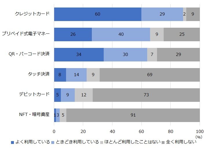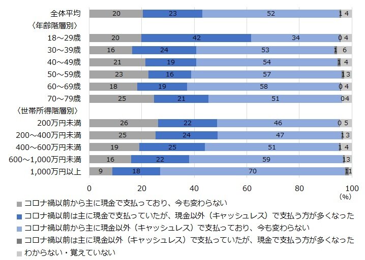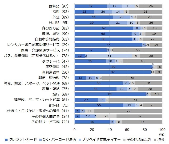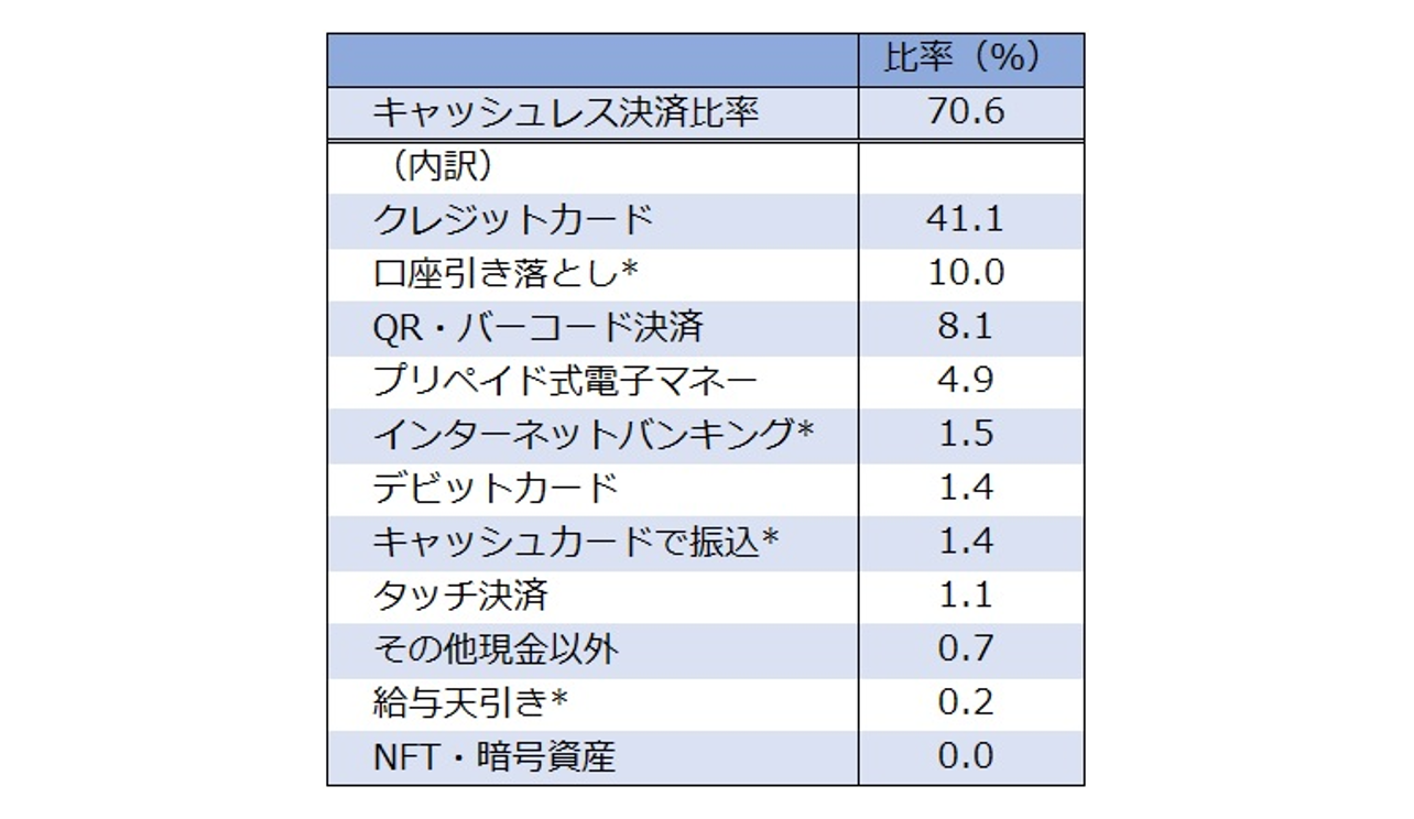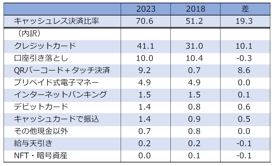 研究報告書 2023.09.29 キャッシュレス決済実態調査2023(速報) この記事は分で読めます シェア Tweet NIRA総合研究開発機構 ※本調査の個票データはこちら 概要 政府は近年、キャッシュレス決済の推進に取り組んでいる。現在のキャッシュレス決済の実態を正確に把握するため、NIRA総研はアンケート調査を実施した。結果として、個人の消費支出額におけるキャッシュレス決済比率は、70.6%であることが明らかになった。5年前の2018年に実施した同調査と比べると、19.3%ポイント増加している。この結果は、従来の統計には含まれない銀行口座間送金なども考慮しており、消費者個人の実感により近いものと考えられる。こうした現状と変化を踏まえた上で、キャッシュレス社会に向けた今後の課題をしっかりと見極めて議論していくことが重要である。 なお、本調査は2023年8月23日(水)~2023年8月28日(月)にかけて行われた。回収数は3,000件で、うち有効回答数(トラップ設問をクリアした人)は2,403件。速報結果は、トラップ設問をクリアした人のみを対象とし(注1)、「国勢調査(2020年)」の対象のうち 18歳以上79歳以下の日本在住者を母集団とみなして、ウェイトによる補正を行った集計結果である(注2)。 (お詫びと訂正) 2023年9月29日公表の数値に誤りがありましたので、お詫びいたします。数値は、正しいものに修正済です。修正箇所については、正誤表をご覧ください。 速報を読む(2023年9月29日公表)(2024年1月4日修正) (1.6MB) 正誤表(2024年1月4日) (405.4KB) 関連レポート/NIRAオピニオンペーパー「大きく進捗したキャッシュレス決済」 (1.7MB) INDEX Ⅰ調査結果 1.支払手段の利用状況 1.1.各種支払手段、サービス等の利用状況 1.2.年齢階層別にみた各種支払手段の利用状況 1.3.世帯の年間所得階層別にみた各種支払手段の利用状況 1.4.現金の所持 2.最も利用したい支払手段 2.1.支払手段の希望 2.2.現金で支払いたい理由 3.品目別の支払方法 3.1.日常的に購入する品目 3.2.定期的に購入する品目 3.3.購入頻度の低い品目 3.4.最近利用が増えている品目 3.5.保険料及び税金 4.個人の消費支出額におけるキャッシュレス決済比率 4.1.全体のキャッシュレス決済比率 4.2.世帯の年間収入階層別にみたキャッシュレス決済比率 4.3.試算の方法 5.時系列の変化 5.1.2018年調査結果との比較 5.2.コロナ禍の前後での支払方法の変化 6.キャッシュレスに対する意識 7.ポイントサービスに対する意識 Ⅱ調査概要 1.調査の趣旨・目的 2.調査名 3.主な調査項目 4.調査期間 5.調査方法 6.回収数 7.本報告書の集計方法 8.回答者の属性 9.研究体制 ポイント●個人の消費支出額におけるキャッシュレス決済の比率は70.6%であった。●最も多いキャッシュレス決済の手段はクレジットカードで41.1%。次いで口座引き落とし(10.0%)、QRコード・バーコード決済(8.1%)となっている。●世帯の所得が高いほど、キャッシュレス決済比率は若干高くなる傾向にある。●5年前の同調査と比べると、キャッシュレス決済比率は19.3%ポイント増加した。●5年前との比較の内訳は、クレジットカードでの支払いが10.1%ポイント増加、QRコード・バーコード決済およびタッチ決済の合計が8.6%ポイント増加、キャッシュカードでの振込が0.5%ポイント増加となっている。一方、口座引き落としは0.3%ポイント減少した。●各支払手段の利用について年齢階層別にみると、クレジットカードを利用する人の割合は18~29歳が若干少ない。一方、QRコード・バーコード決済の利用は若い人ほど多い。●支払時に利用したい手段は、クレジットカードが最も多く40%、次いでQRコード・バーコード決済が25%、現金は19%である。 図表図1-1-1 各種支払手段の利用状況図1-1-2 関連サービス等の利用状況図1-2-1 年齢階層別にみたクレジットカードの利用図1-2-2 年齢階層別にみたプリペイド式電子マネーの利用図1-2-3 年齢階層別にみたQRコード・バーコード決済の利用図1-3-1 世帯の年間所得階層別にみたクレジットカードの利用図1-3-2 世帯の年間所得階層別にみたプリペイド式電子マネーの利用図1-3-3 世帯の年間所得階層別にみたQRコード・バーコード決済の利用図1-4 現金の所持金額(全体平均、年齢階層別、世帯の所得階層別)図2-1-1 支払手段の希望図2-1-2 年齢階層別にみた支払手段についての考え図2-1-3 世帯の所得階層別にみた支払手段についての考え図2-2-1 現金で支払いたい理由図2-2-2 年齢階層別にみた現金で支払いたい理由図3-1 日常的に購入する品目の支払方法図3-2 定期的に支払う品目の支払方法図3-3 購入頻度の低い品目の支払方法図3-4 最近利用が増えている品目の支払方法図3-5 保険料及び税金の支払方法表4-1 個人の消費支出額におけるキャッシュレス決済比率図4-2 世帯の年間所得階層別にみたキャッシュレス決済比率表5-1 キャッシュレス決済比率の5年前との比較図5-2 コロナ禍の前後での支払方法の変化図6-1 CBDCへの認識図6-2 デジタル給与の受け取りの希望図7-1 利用しているポイントサービスの種類図7-2 共通ポイントサービスの利用図7-3 ポイントサー