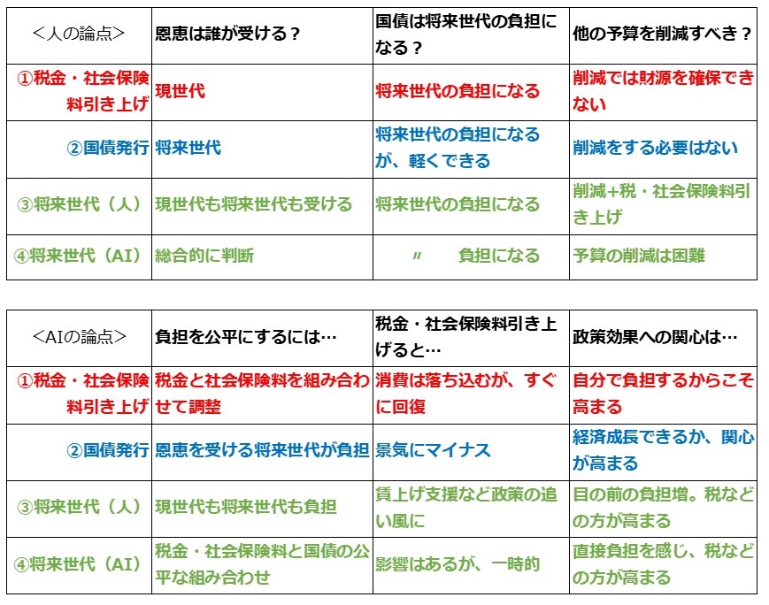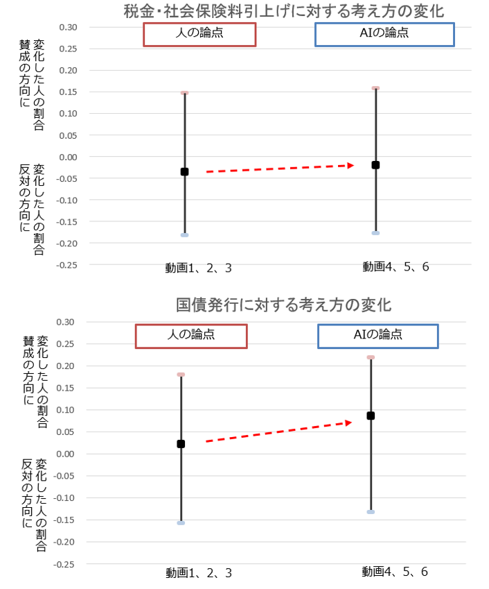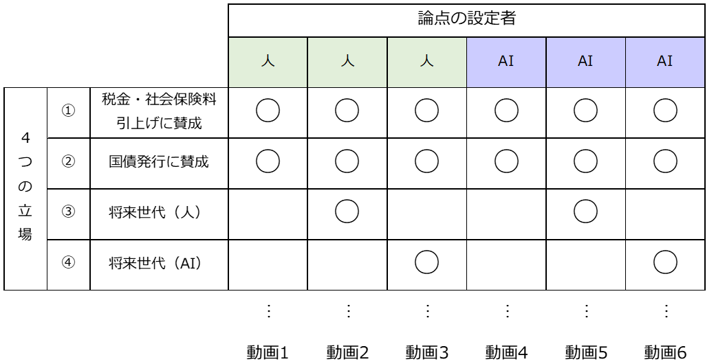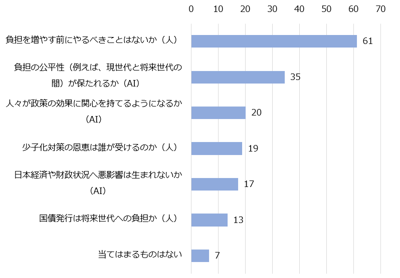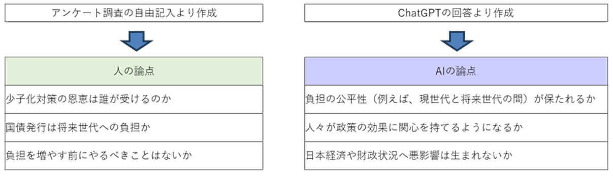 研究報告書 2024.02.20 AIは民主主義を深化させるか?少子化政策の財源に関する調査実験 この記事は分で読めます シェア Tweet 谷口将紀 東京大学大学院法学政治学研究科教授/NIRA総合研究開発機構理事長 鈴木壮介 NIRA総合研究開発機構研究コーディネーター・研究員 竹中勇貴 NIRA総合研究開発機構研究コーディネーター・研究員 概要 人の役割をAIが代替する局面が増えているが、政治的熟議にAIは活用できるのであろうか。熟議の要諦は、人々が様々な情報に触れながら自らの意見を再考・修正するところにある。人々の情報収集をAIが支援するなど、熟議の過程にAIを介入させたとき、人々の意見形成にどのような影響が及ぶのか。 本プロジェクトでは、少子化政策の財源は税金・社会保険料と国債のどちらがよいかという争点を例に、熟議におけるAI活用の可能性を探り、以下の結論を得た。第1に、将来世代の意見を人間が予測してもAIが生成しても、その意見を見ると、将来世代の意見に接しないときと比べて人々は税金・社会保険料の引き上げに肯定的で、国債発行に否定的になる。第2に、将来世代の意見をAIが生成した場合も、人間が作った場合から少子化対策の財源に関する人々の考え方の変化に大差は見られなかった。第3に、人が提示した論点は自己中心性バイアスがみられるのに対し、AIが提示した論点はより多様な視点に立っており、かつ多くの回答者から重要な論点として評価された。 これらの知見は、民主政治における意見の提示や論点の設定という人間の役割を、AIは不自然ではない程度に代替できることを示唆している。 エグゼクティブサマリーを読む (189.2KB) PDFで読む (12.4MB) INDEX 第1章 研究の動機 1.熟議におけるAI活用の可能性 2.少子化政策の財源問題 第2章 研究方法 1.論点の抽出 2.論点に対する意見と動画の作成 3.人々の意見の変化の集計方法 第3章 調査結果 1.将来世代の意見を見ることによる影響 2.将来世代の意見をAIが作成したことによる影響 3.論点をAIが作成したことによる影響 第4章 結論 付録1 事前調査概要 付録2 本調査概要 付録3 本調査の質問票と単純集計結果 付録4 本調査の動画のスクリプト ポイント●人々が少子化政策の財源に関する論点について考えると、自身の損得を優先的に考える自己中心性バイアスを帯びた視点が多くなった。●AIが少子化政策の財源に関する論点を抽出すると、専門家が発信している論点を包括する傾向が見られた。●AIが抽出した論点についても人々は重要だと考えており、AIを活用した論点設定の有効性がうかがえた。●人々がこれから生まれてくる将来世代の意見を見ると、少子化政策の財源確保のために税金・社会保険料の引き上げに肯定的になる一方、国債発行には否定的になった。●将来世代の意見を、人間が予測した場合でもAIが生成した場合でも、人々に与える影響について有意な差は見られず、双方を比べても遜色ない結果となった。●AIが生成した将来世代の意見を見た回答者に、違和感があったかどうかを聞くと、64%が「違和感はなかった」と回答した。図表図2-1 人々が考える少子化対策の財源図2-2 少子化対策の財源に関する論点表2-3 論点ごとの回答要旨表2-4 6つの動画の内容図2-5 本調査の概要表3-1 熟慮前後での意見分布図3-2 将来世代の意見の有無による考え方の変化図3-3 将来世代の有無での比較図3-4 AIが意見を作成したことによる考え方の変化図3-5 人の意見、AIの意見での比較図3-6 AIの意見への違和感図3-7 AIが論点を作成したことによる考え方の変化図3-8 人の論点、AIの論点での比較図3-9 人が重要だと思う論点 第1章 研究の動機 要旨 人の役割をAIが代替する局面が増えているが、政治的熟議にAIは活用できるのであろうか。熟議の要諦は、人々が様々な情報に触れながら自らの意見を再考・修正するところにある。人々の情報収集をAIが支援するなど、熟議の過程にAIを介入させたとき、人々の意見形成にどのような影響が及ぶのか。これが本研究の動機である。 本稿では、少子化政策の財源は税金と国債のどちらがよいかという争点を例に、熟議におけるAI活用の可能性を探る。 1.熟議におけるAI活用の可能性 研究の趣旨 AI(Artificial Intelligence、人工知能)は民主政治の味方か、それとも敵か。NIRA総合研究開発機構のプロジェクト「AIを活用した熟議プラットフォームの形成」は、熟議民主政治に対するAIの活用可能性を検討した。 AIによるチャットツールとして、ChatGPTは広く知られている。ChatGPTは、OpenAIが開発した言語モデルの1種で、膨大なテキストデータの学習を通じて、ユーザーが与えた入力に対する応答を生成でき、尋ねた質問に答えたり、対話を行ったりする。 そこでは政治や経済に関するトピックスも対象になりうるが、将来さらにAIの技術が進んだとしても、AIが政治家を完全に置き換え、民主政治のすべてを担うことは難しい。民主政治とは決定された結果のみならず、その決定に至る過程も含むものだからである。もし、民主政