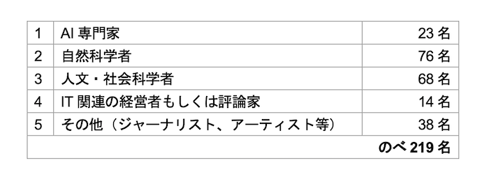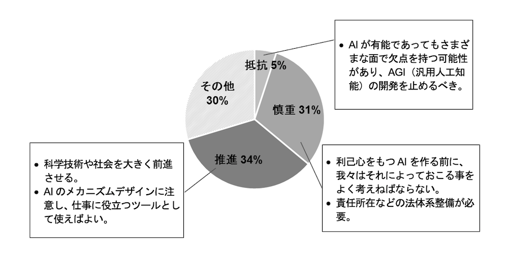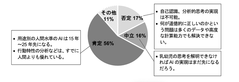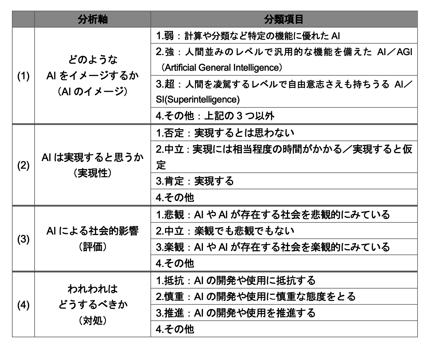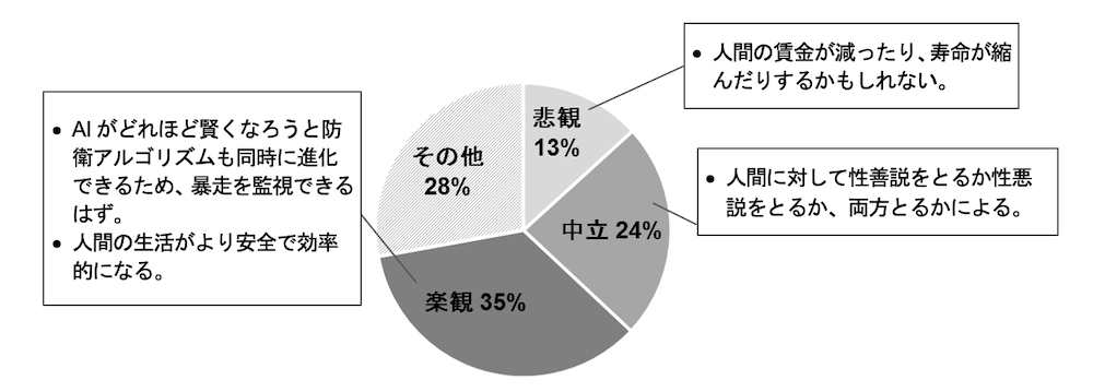 論文NIRAモノグラフシリーズNo.39 2016.07.01 AIをどう見るか “Edge Question”から探るAIイメージ この記事は分で読めます シェア Tweet 公文俊平 多摩大学情報社会学研究所所長/NIRA総合研究開発機構上席客員研究員 羽木千晴 NIRA総合研究開発機構研究コーディネーター・研究員 概要 近年、人工知能(AI)で「ディープラーニング(深層学習)」と呼ばれる手法が開発され、その技術がさまざまな形で実用化されれば社会に革新的な変化をもたらすとして大きな期待が寄せられている。他方、AIに知的労働を代替されるという危機感や、近い将来、人知を圧倒的に凌駕する知能を持つ機械が出現するとされる「シンギュラリティ(技術進歩の特異点)」への懸念など、AIが引き起こしうる事態を案ずる論者も存在する。 AIが人類全体に与える影響は大きく、不可逆的なものであることを考えれば、AIに関する議論はAIの専門家だけでなく、分野を超えて積極的に行う必要がある。そこで、本稿では、さまざまな分野の専門家192名がAIに対する考えを寄稿した“Edge Question”を、4つの観点―各識者がイメージするAIのレベル、その実現可能性、それによる社会的影響、そしてAIの開発や推進に対する意見―から分析し、AIを巡る国際的な議論の動向を整理した*。 PDFで読む (970.3KB) INDEX はじめに 1. Edge.orgとは 2. 調査概要 (1)識者の専門分野 (2)意見を指標化するための分析軸 3. 4軸でみた識者の意見 (1)AIのイメージ (2)実現性 (3)評価 (4)対処 (5)まとめ 4. 意見の傾向 (1)全体の傾向:意見を決定づけるのは、評価と対処 (2)AI専門家とIT経営者はポジティブな見方 (3)各グループの代表的な意見 5. まとめ (1)少数派の意見の尊重 (2)AIの「イメージ」や「実現性」が議論の前提 (3)整合性のある意見の集約 はじめに 近年、人工知能(AI)で「ディープラーニング(深層学習)」と呼ばれる手法が開発され、その技術がさまざまな形で実用化されれば社会に革新的な変化をもたらすとして大きな期待が寄せられている。他方、AIに知的労働を代替されるという危機感や、近い将来、人知を圧倒的に凌駕する知能を持つ機械が出現するとされる「シンギュラリティ(技術進歩の特異点)」への懸念など、AIが引き起こしうる事態を案ずる論者も存在する。昨年、テスラモーターズCEOのElon Musk氏や、イギリス人理論物理学者であるStephen Hawking氏が科学諮問委員を務める非営利団体の“Future of Life Institute(FLI)”が、公開書簡を通じて、AIシステムの堅牢性と社会的便益を兼備させたうえで研究開発に臨むことが重要であると主張したことがマスコミでも大きく取り上げられた。同団体は、AIが搭載された自律型兵器の開発が行われないよう同兵器の開発禁止を訴えており、今後、こうした議論が本格化するであろう。 こうした中、日本は技術立国でありながらも、グローバルなイニシアチブを取ろうという機運に欠けているように思われてならない。日本も欧米の議論が決着していくのを傍観しているのではなく、自ら積極的に議論に参加していく必要があるのではないだろうか。 そこで、本稿では、世界的に著名な科学技術ウェブサイト“Edge.org”の寄稿誌である“Edge Question(エッジ・クエスチョン)”を取り上げ、そこで掲載されている192名の人々の人工知能についての論稿を分析し、世界におけるAIの議論の動向を把握し、今後日本においても議論すべき論点を明らかにする。 1. Edge.orgとは “Edge.org”は、著作権エージェントであるJohn Brockman氏によって開設されたウェブサイトである。その原点は、1981年から1996年の間に主にニューヨークで行われた知識人による非公式会合、“The Reality Club”にある。知の交換というクラブのモットーを引き継いだまま、その会合の場をウェブ上へと移し、オンライン・サイエンス・サロンとなった。サイトでは、そのモットーのとおり、科学者、哲学者や起業家など各界のフロンティアとして活躍するオピニオンリーダーが、主に対談を通じて、テクノロジーから文化に至る幅広い分野の最先端の情報を発信・交換している。 同サイトで、毎年話題性のあるテーマに関して200人近い知識人の寄稿文を紹介する企画が、“Edge Annual Question”である。寄稿する知識人には各界で影響力のある人物も多く含まれるため、Annual Questionが発表される時期になると、その内容に注目が集まる。実際、同企画については、本国アメリカのウォールストリートジャーナルやニューヨークタイムズ紙は当然のこと、世界中の新聞や雑誌で取り上げられている 2015年のテーマは、“WHAT DO YOU THINK ABOUT MACHINES THAT THINK?”(考える機械についてあなたはどう思うのか?)であった。研究者、ジャーナリスト、小説家など多分野で活躍している192名の人々が寄稿しており、ウェブ上で多様な意見が紹介されている。 2. 調査概要 本研究では、ウェブサイトに公開されている上記2015年テーマに寄稿した識者の意見を分析し、識者のAIについての見解について、以下の条件で指標化を行った。それぞれの識者の見
