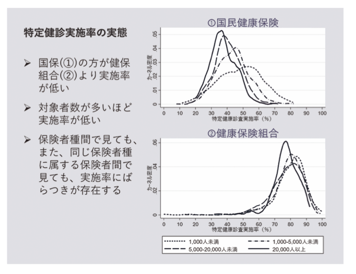 論文NIRAモノグラフシリーズNo.41 2019.09.01 医療保険者による病気予防・健康づくりの実態ばらつき目立つ保険者の取組 この記事は分で読めます シェア Tweet 翁百合 NIRA総合研究開発機構理事/日本総合研究所理事長 関島梢恵 NIRA総合研究開発機構研究コーディネーター・研究員 概要 2019年3月に、厚生労働省が初めて公表したデータが2つある。1つは糖尿病など生活習慣病の予防を目的として行う特定健康診査・特定保健指導の保険者別の実施率であり、もう1つは後発医薬品の保険者別の使用割合だ。これまで国保や健保組合など保険者種別の実施率や国全体の数字は出ていたが、全保険者の実績が明らかになったのは初めてだ。 保険者による健康増進や医療費適正化への取組は、超高齢社会で社会保障費が増大する中、制度を維持するための活路の1つだ。個々の保険者の実績を「見える化」し、保険者に取組の推進を促さなければならない。本稿では、保険者の取組の現状をデータから整理・分析し、保険者間のばらつきの是正と今後議論すべき課題を提言する。 エグゼクティブサマリーを読む (884.4KB) 全文を読む (2.9MB) INDEX エグゼクティブサマリー● 保険者による取組のばらつき 特定健診・保健指導の実施率には保険者間で大きなばらつきがある。保険者種の違いを2つのグラフ(下図)で比較すると、国保の特定健診実施率は健保組合と比べて極めて低い。 加えて、規模の大きい保険者ほど特定健診や保健指導の実施率が低いといった保険者の特徴による差も存在する。また、被扶養者の実施率が低いなど、保険者の中でも予防医療の取組が届いていない層がある(本文p.13参照)。 ● 保険者の意識が生む差 保険者の取組にばらつきが生じる要因の1つに、保険者の意識の違いがありそうだ。花王や明治安田生命、第一生命、大和証券グループ、京セラなどは、被保険者を多く抱えながらも、特定健診・保健指導の実施率が高い。「健康経営優良法人2019」に認定され、健康経営への高い意識がうかがえる。保険者の取組事例を調べていくと、実施率向上のための様々な工夫が見つかった。 被保険者にとって、加入する保険者は職業や勤務先または住む場所などによって確定され、自由に選ぶことができない。保険者の意識の差が、予防医療の取組を通じて被保険者の健康の差に表れるとしたら問題だ。専業主婦など被用者保険の被扶養者であれば、なおさら保険者の意識が及びにくく、病気予防や健康づくりから取り残されてしまう。こうした差を解消しない限り、国民誰もがより長く元気に活躍できる社会は実現しない。● 保険者間のばらつきを是正し、制度設計を工夫せよ 個々の保険者の意識を高め、保険者による取組のばらつきを是正し、国民全体の健康増進を図らなければならない。そのためには、保険者に対し適切な予防に取り組むインセンティブを付与するとともに、被扶養者へのアプローチや、予防医療を担う保健師等の専門人材の配置、健康診査内容や手法のPDCAなどを考える必要がある。保険者機能が一層発揮される工夫が望まれる。 目次はじめに1. 特定健康診査・特定保健指導1-1. 全体像 特定健診は健保の実施率が国保を大きく上回る 特定保健指導の実施率はどの保険者も非常に低い 保険者ごとのばらつきと大規模保険者の低実施率が課題 保険者の中にも潜む実施率の差―被扶養者へのアプローチ 保険給付費との明確な関係は見出せず1-2. 個別の保険者 企業「経営」としての取組が高実施率を実現 小規模な国保が工夫を重ねて高実施率 保険者の意識の高さで大きな違い コラム1.健保組合の取組例(南都銀行健康保険組合) コラム2.市町村国保の取組例(福岡県広川町)2. 後発医薬品2-1. 全体像 保険者ごとのばらつきは少ないが、国保の使用割合が低め2-2. 個別の保険者 沖縄の市町村国保の使用割合が高い3. 提言参考文献図表参考 特定健康診査・特定保健指導の概要図表1-1 医療保険制度の概要図表1-2 保険者種別特定健康診査実施率の分布(2017年度)図表1-3 健康診査対象者数別実施率の分布(2017年度)図表1-4 保険者種別特定保健指導実施率の分布(2017年度)図表1-5 特定保健指導対象者数別実施率の分布(2017年度)図表1-6 人口当たり保健師数別実施率の分布(2017年度、市町村国保)図表1-7 保険者種別・性別特定健康診査実施率(2017年度)図表1-8 保険者種別・被保険者/被扶養者別特定健康診査実施率(2017年度)図表1-9 特定健康診査・特定保健指導実施率と保険給付費(2017年度、市町村国保)図表1-10 特定健康診査・特定保健指導実施率が高い保険者(全体、健診実施率順)図表1-11 特定健康診査・特定保健指導実施率が低い保険者(全体、健診実施率順下位10)図表1-12 特定健康診査・特定保健指導実施率が高い保険者(国保、健診実施率順上位10)図表1-13 特定健康診査・特定保健指導実施率が高い保険者(国保、健診対象者数順上位10)図表2-1 保険者種別後発医薬品使用割合の分布(2018年9月診療分)図表2-2 年齢階級別後発医薬品使用割合図表2-3 後発医薬品使