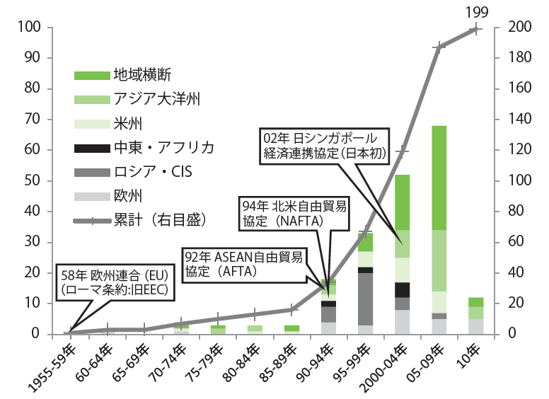 English version NIRAオピニオンNo.6 2012.01.18 なぜTPPなのか国際通商システムの視点から考える この記事は分で読めます シェア Tweet 伊藤元重 総合研究開発機構(NIRA)理事長 概要 TPPへの参加を巡って国論を二分する論争が行われたが、正確な情報や分析に基づいた本質的な議論が行われたとは言い難い。TPPなどの地域経済連携はWTO体制を補完し、より深い経済統合の実現を目指すものであり、日本の成長戦略の中核となるものである。本稿では、国際通商システムの視点から「なぜTPPなのか」を解説し、日本がTPPに背を向ける選択はあり得ないことを論じる。 PDFで読む (1.3MB) English(PDF) (245.5KB) INDEX 21世紀型の通商交渉はどんな姿になるのか TPPが出てきた背景はなにか TPPへの参加意欲は日中韓の経済連携を促す 通商交渉における「連鎖反応」 日本がTPPに背を向ける選択はあり得ない 日本を開かれた社会にするために 21世紀型の通商交渉はどんな姿になるのか 20世紀の後半の50年、世界経済は貿易自由化の推進によって大きく成長した。その中心にあったのが、GATT(関税及び貿易に関する一般協定)とそれを受け継いだWTO(世界貿易機関)である。 WTOは優れた制度である。世界の多くの国を取り込んだ多国間(マルチ)の仕組みであることがこの制度の強みである。すべてのメンバー国に無差別の対応を求める最恵国待遇(MFN)原則は、世界全体に自由化交渉の利益を広げる上で大きな役割を果たした。WTOの制度の下で、先進工業国の関税率は非常に低い水準に下がった。新興国も積極的に自国市場を開くことによって、経済成長を実現しつつある。 しかし、21世紀に入り、WTOの機能の限界が顕著になってきた。先進国と新興国の意見が対立して交渉が進まないドーハラウンドはその象徴である。より多くの国が参加して、より踏み込んだ自由化を進めようとすれば、交渉は困難になるのは避けられない。 もちろん、WTOの重要性が失われたわけではない。WTOのルールによって、各国が手前勝手な通商政策を行えないようになっているからだ。安易に関税率を上げたり、違法性のある手法で貿易を制限することは、WTOのルールで禁じられている。多くの国はこのルールを尊重している。また、2国間で貿易問題の紛争が生じたとき、WTOはその紛争の調停役を果たしている。この紛争調停機能はますます重要になっているように思われる。 日本がWTOを支えていくべきであることは言うまでもない。難しい状況に陥っているドーハラウンドについても、なんとか合意に到達する努力を続けていかなければいけない。ただ、WTOだけに今後の世界の通商システムの命運を委ねることができないことは明らかだ。WTOを補完する何らかのメカニズムが求められている。 20年ほど前から、世界の多くの地域で自由貿易協定(FTA)や経済連携協定(EPA)が次々に締結されてきたのは、こうした変化を背景にしたものであった(図表1)。経済関係の深い近隣諸国と貿易自由化を迅速に進めることができることがその利点である。また、関税撤廃という国境措置の自由化だけでなく、より踏み込んだ自由化や国内制度の調整にまで交渉を広げることで、「より深い統合」(deeper integration)を実現することが期待された。少し乱暴な整理ではあるが、WTOが多国間を取り込んだ広く薄い自由化を達成する上で優れた制度であるとすれば、FTA・EPAは特定の国や地域に限定した狭く深い自由化を実現していく上で優れているのだ。 21世紀に入り、各国は相互に踏み込んだ自由化を進めていくことで、より深い統合を実現することを迫られている。そして地域経済連携を突破口にして、それをWTOに広げていく。この2つのアプローチの補完性を最大限に活用していくことが、21世紀型の自由化交渉となるだろう。 図表1 世界のFTA・EPAの発効件数 1990年代以降発効件数が急速に拡大 (注)2011年6月1日現在。(出所)JETRO『世界貿易投資報告』(2011年版)を基に作成(原資料はWTOホームページ)。 TPPが出てきた背景はなにか 地域経済連携を進めていくと、特定の国や地域の間でだけ連携が高まり、ブロック経済化するという懸念を指摘する人がいる。しかし、当面のところ、その心配はないようだ。1930年代の世界大恐慌の時代に起きたブロック経済化は、米国、英国グループ、フランスグループなど、特定の国や地域が自分たちの周りに高い関税障壁を設け、相互に排他的な経済圏を設けたものである。 現在、世界のあちこちで進展している地域経済連携の流れが、こうしたブロック経済化とはまったく異なるものであることは明らかだ。WTOの下で、各国の関税は低くおさえられ、1930年代のように特定の地域に対する関税が大幅に引き上げられることはない。また、各国・地域の間で200近くのFTA・EPAが締結され、多くの国が重なり合う形で地域経済連携が進んでいる。地域が分断されるブロック経済とはなっていないのだ。 コロンビア大学のバグワッティ教授の表現を借りれば、地域経済連携が世界全体の自由化の障害となる「