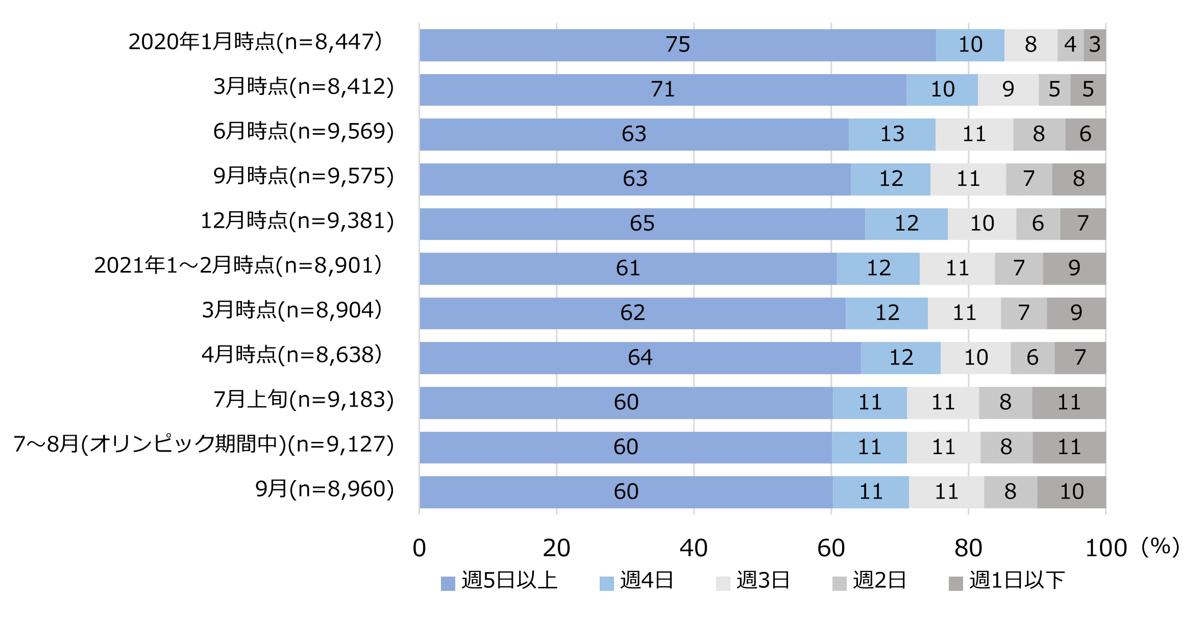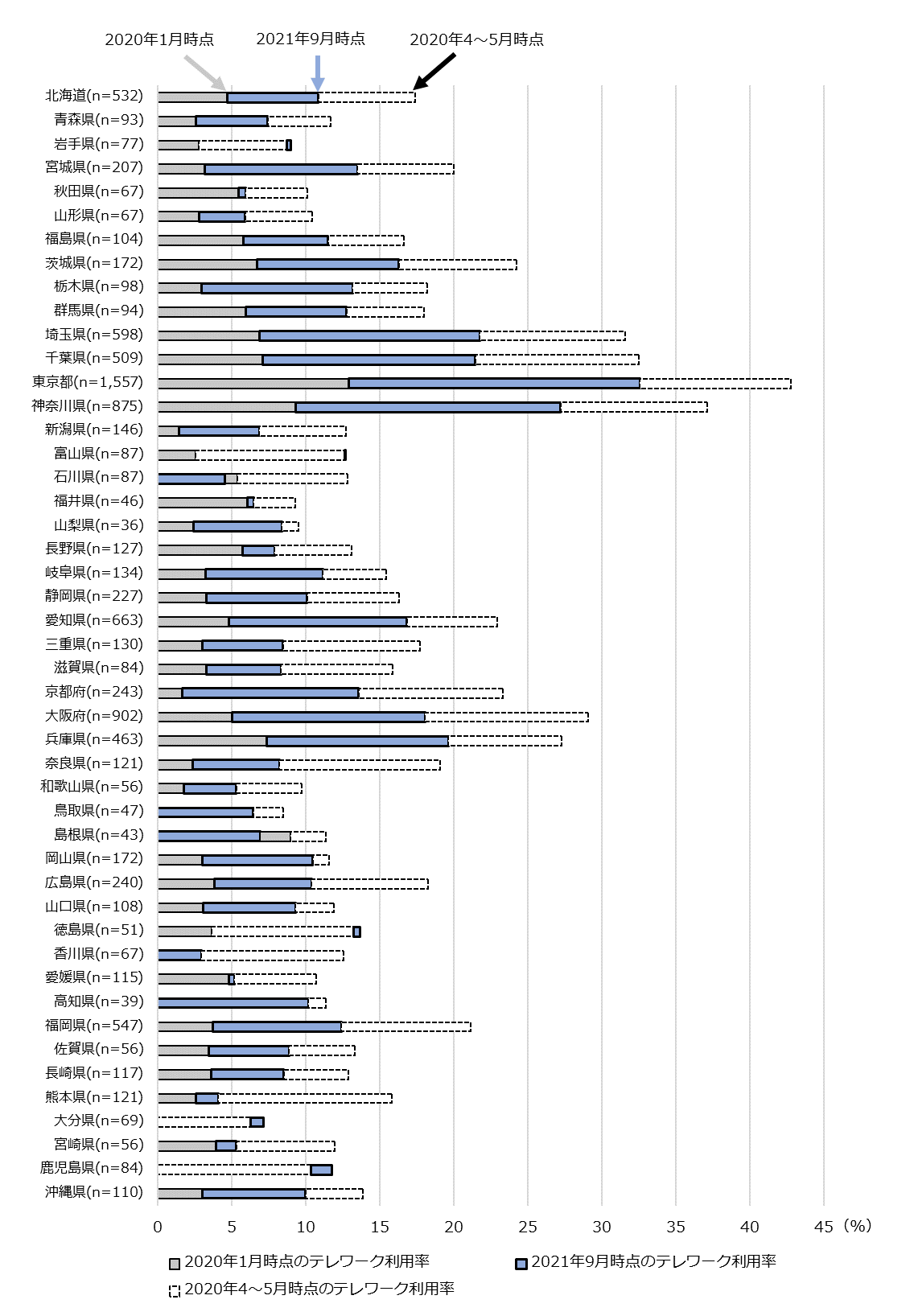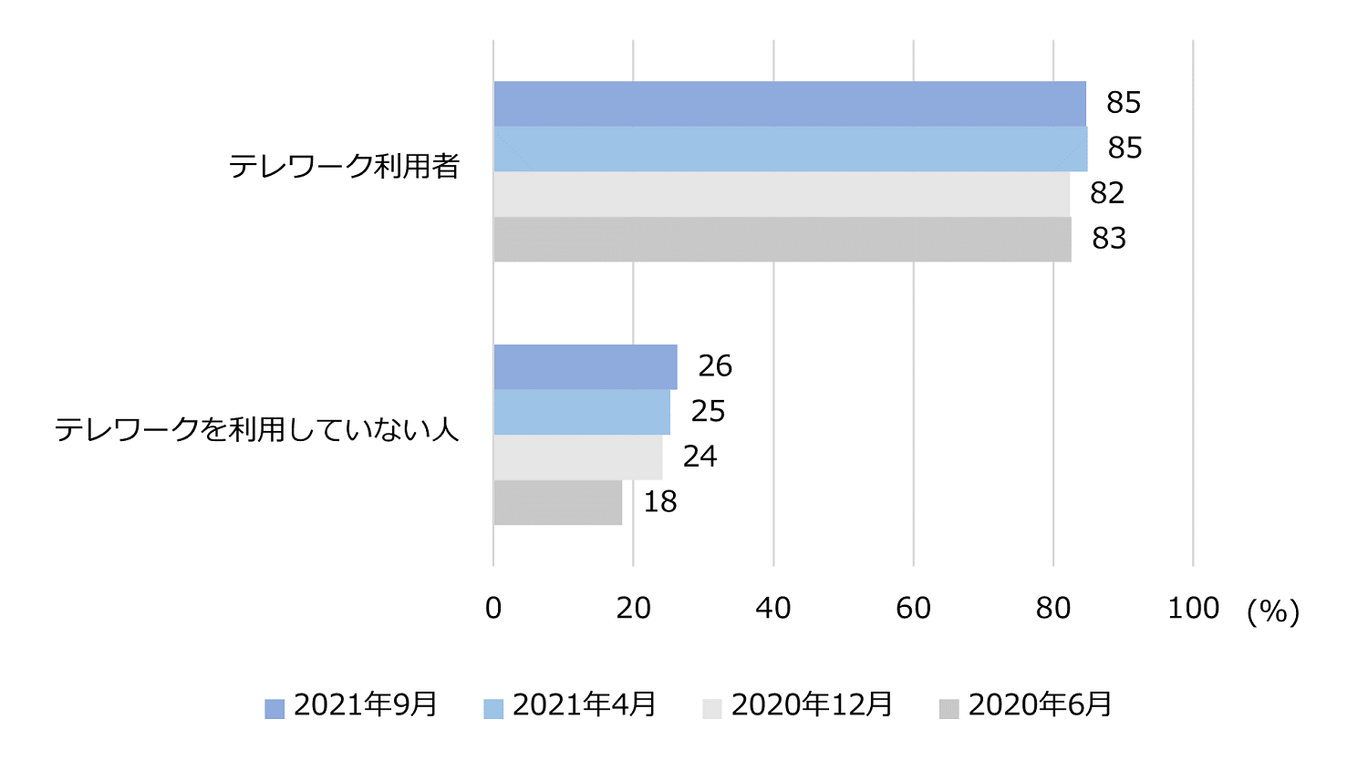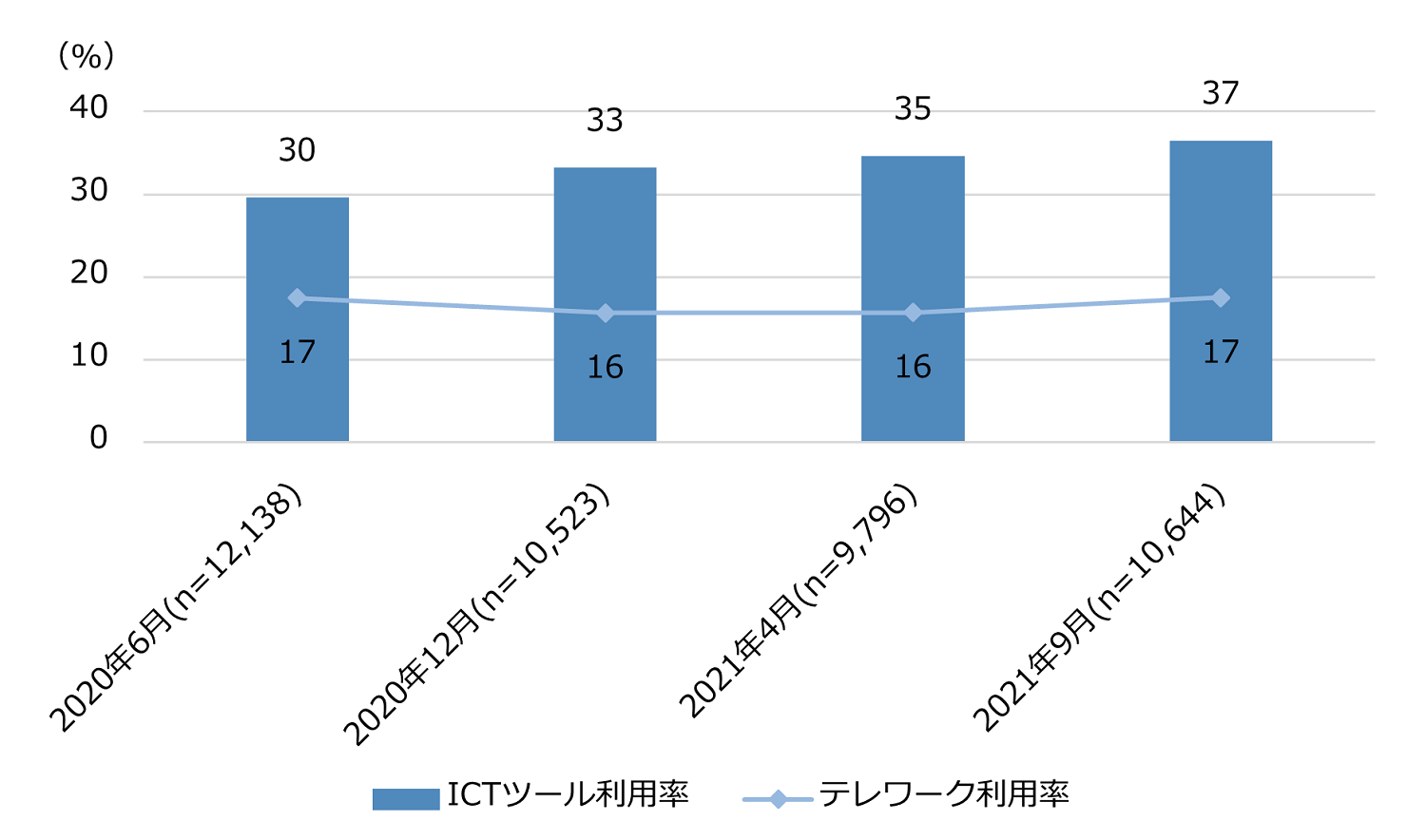 研究報告書 2021.10.07 第5回テレワークに関する就業者実態調査(速報) この記事は分で読めます シェア Tweet 大久保敏弘 慶應義塾大学経済学部教授 NIRA総合研究開発機構 最新の調査結果はこちら➡「第10回テレワーク調査」 概要 慶應義塾大学経済学部大久保敏弘研究室、(公財)NIRA総合研究開発機構では、「第5回テレワーク(注1)に関する就業者実態調査(注2)」を実施した。本調査は、新型コロナウイルスの感染拡大による、全国の就業者の働き方、生活、意識の変化や、業務への影響等の実態を捉えることを目的に実施したものである。調査は2021年9月4日(土)~22日(水)にかけて行われた。回収数は10,644件であり、うち過去の同調査からの継続回答は8,455件である。速報結果は以下のとおり。詳細版は2021年12月を目途に公表する予定である。 PDFで読む (2.5MB) INDEX 1. テレワーク利用率 2. 通常の職場での勤務とテレワークによる勤務の頻度 3. 仕事の効率の変化 4. ICTツールの活用状況 5. メンタルヘルス 6. 新型コロナウイルス感染 7. ワクチン接種 8. 新型コロナウイルスの感染や影響の予測 9. グリーン・ジョブ 調査概要 ポイント●2021年9月1週目時点の全国の就業者のテレワーク利用率は17%(東京圏28%)となった。2020年6月以降は、ほぼ同水準で推移している。2回目以降の緊急事態宣言発令中やオリンピック開催中も、テレワーク利用率に大きな変化はない。しかし、テレワーク利用頻度は緩やかに増加してきており、テレワークと出社を組み合わせた働き方のバランスが、全体としては、テレワークの比重が高い方向にシフトしている。●テレワークで仕事の効率が低下する要因として、仕事の特性上テレワークが困難であること、コミュニケーションの悪化、自宅環境に課題があることを回答する人の割合が高い。一方、テレワークで仕事の効率が上昇する要因として、疲労の軽減、仕事の特性上テレワークが向いていること、自宅環境の良さを回答する人の割合が高い。●ICTツールの活用状況は、2021年9月時点で、テレワーク利用者は85%である一方、テレワークを利用していない人は26%と、テレワーク利用者のICT利用率が顕著に高い。時系列の変化として、オフィス勤務者のICTツールの利用が広がっており、全体のICT利用率が徐々に上昇している。●新型コロナウイルスの感染経験のある人は、感染経験のない人よりも、メンタルヘルスが悪く、また、経済的な困窮への不安を感じている。また、ワクチンの接種状況に性別による差はないが、年齢が若いほど接種完了率が低い傾向にある。「接種しない」と回答した人の割合は年齢が若いほど大きく、10~20代では23%にのぼる。●自身の仕事がグリーン・ジョブに該当する人(一部が該当する人も含む)の割合は、就業者全体の31%であった。特に、環境問題への意識の向上や、リサイクルなどの活動が比較的行われている。グリーン・ジョブに携わる人が、仕事の中でグリーン・ジョブに費やす時間の割合は、10%と回答した人が最も多かった。 図表図表1 全国および東京圏のテレワーク利用率図表1-1 居住都道府県別でみたテレワーク利用率-新型コロナウイルス感染拡大前、第1回緊急事態宣言時、直近時点の比較-図表1-2-1 産業別でみたテレワーク利用率図表1-2-2 産業別(抜粋)でみたテレワーク利用率の推移図表1-3-1 所得階層別でみたテレワーク利用率図表1-3-2 所得階層別でみたテレワーク利用率の推移図表2-1 通常の職場で勤務している人の出社頻度図表2-2 テレワーク利用者の利用頻度図表3a 仕事の効率(2021年9月、テレワーク利用別)図表3b テレワーク利用者の仕事の効率の変化図表3-1 テレワークで仕事の効率が低下する要因図表3-2 テレワークで仕事の効率が上昇する要因図表4-1 ICTツールの活用状況(テレワーク利用別)図表4-2 ICTツールの活用状況図表4-3 目的別のICTツール活用状況(テレワーク利用別)図表4-4 個別ICTツールの活用状況(テレワーク利用別)図表5-1 2019年度国民生活基礎調査のK6の合計点の分布(12歳以上)図表5-2 2019年度国民生活基礎調査のK6の合計点の分布 有業人員(15歳以上)図表5-3 K6の分布図表5-4 性別、年齢階層別でみたK6の分布(2021年9月)図表6-1 新型コロナウイルスの感染経験とK6の分布図表6-2 新型コロナウイルスの感染経験と経済的な困窮への不安図表7 新型コロナワクチンの接種状況(2021年9月時点)図表8 新型コロナウイルスの感染や影響の予測図表9-1 グリーン・ジョブに携わっている人の割合図表9-2 グリーン・ジョブに携わっている人の割合(分類別)図表9-3 グリーン・ジョブに携わっている人の割合(産業別)図表9-4 グリーン・ジョブに費やす時間の割合(グリーンジョブに携わっている人のみ) 調査概要調査方法:インターネット調査(スクリーニング調査・本調査)。回収目標数を10,000サンプルとして、過去の調査と同様のスクリーニング調査、割付を行ったうえで、配信し、回収した。(注3)調査機関:株式会社日経リサーチ調査対象者:調査会社に登録しているインターネット調査登録モニター調査対