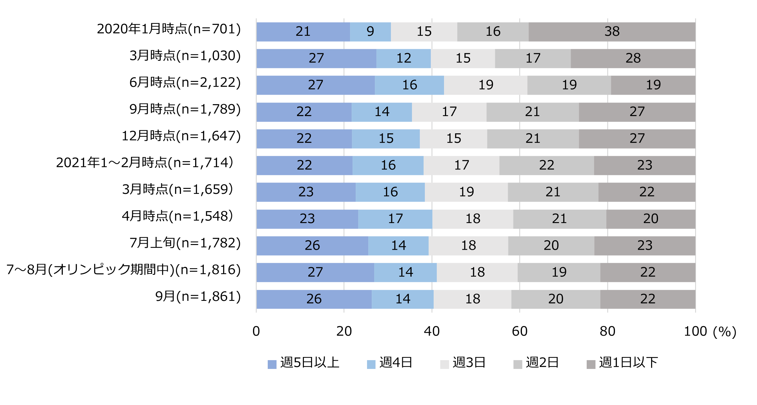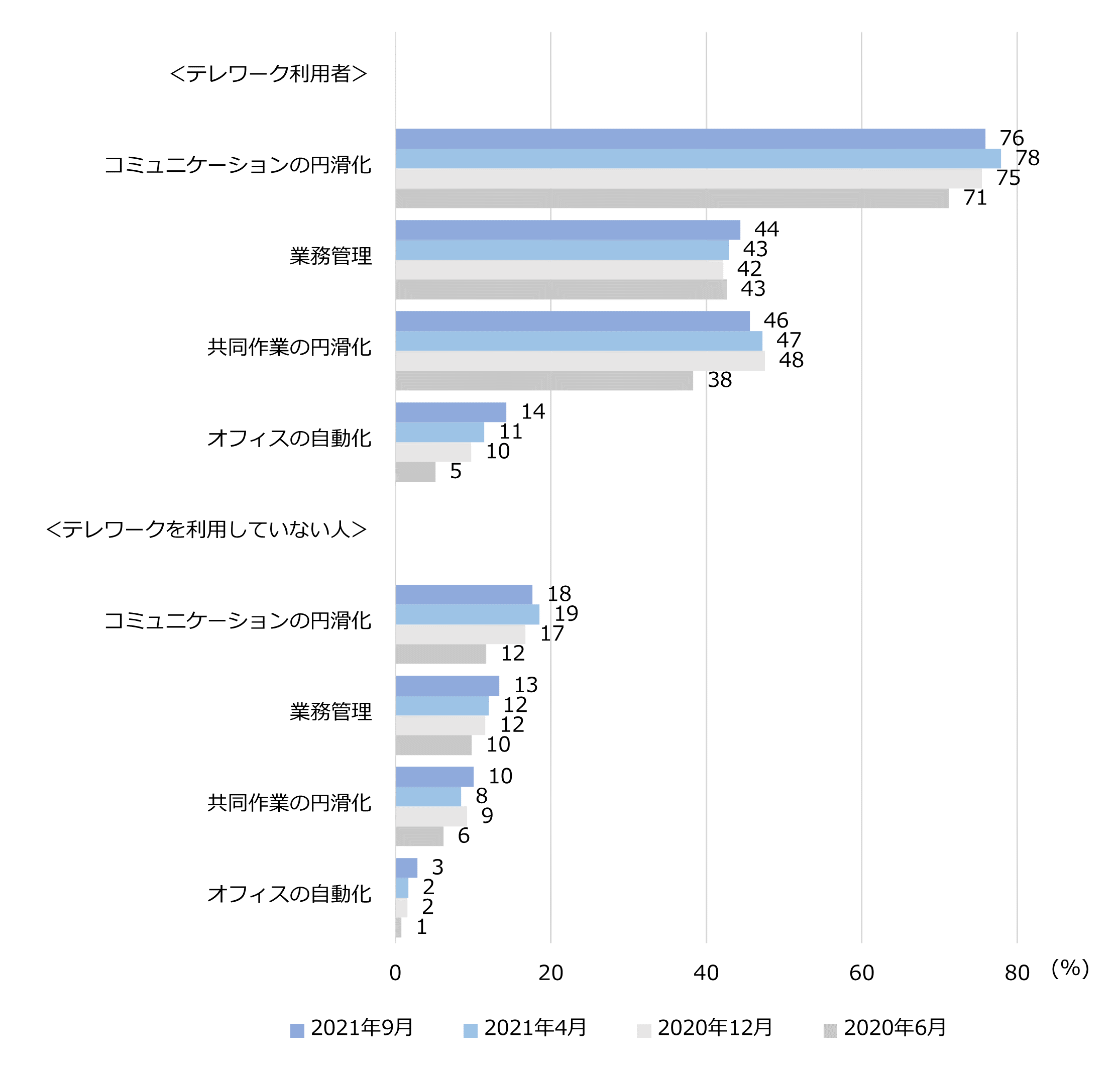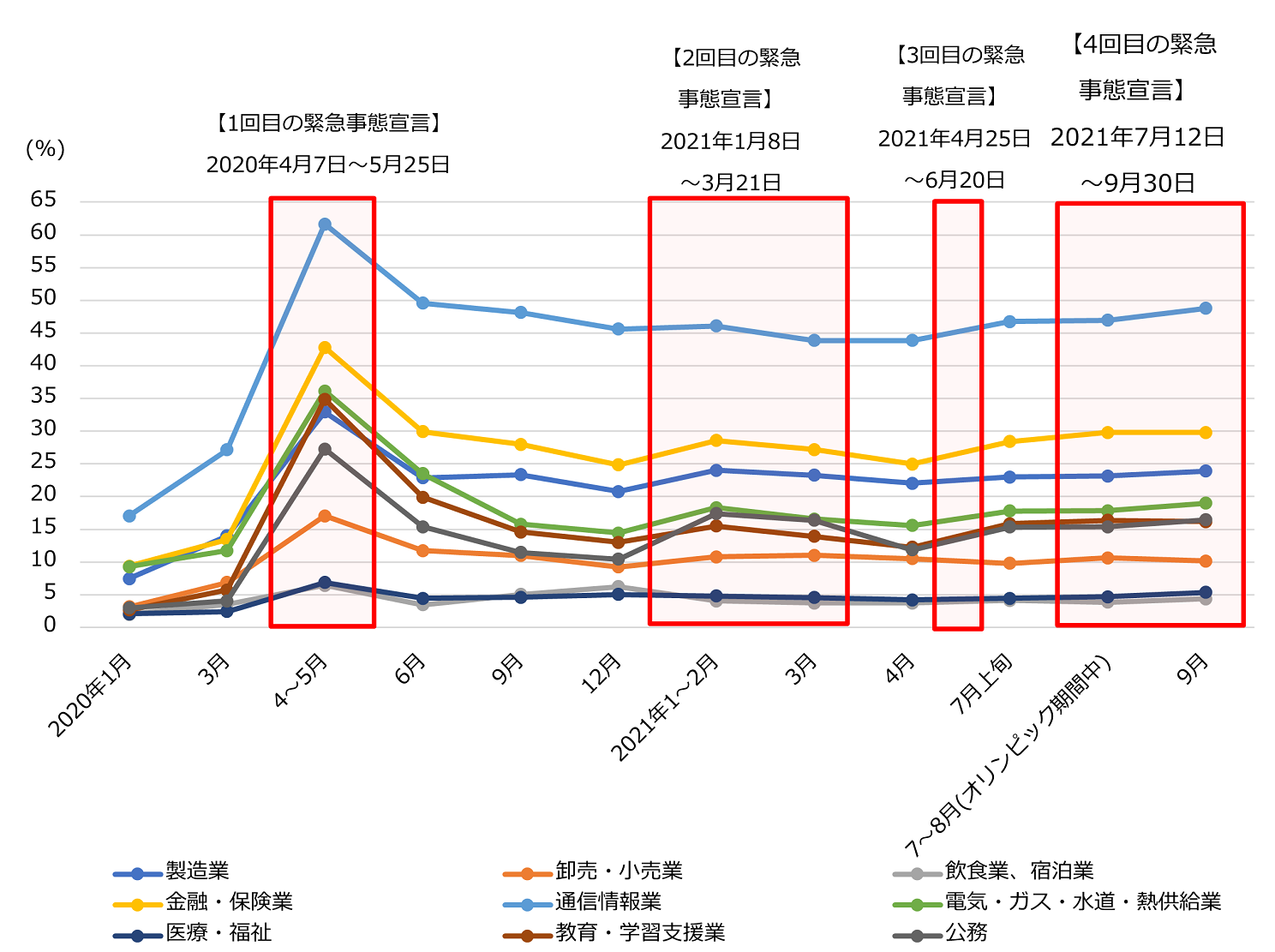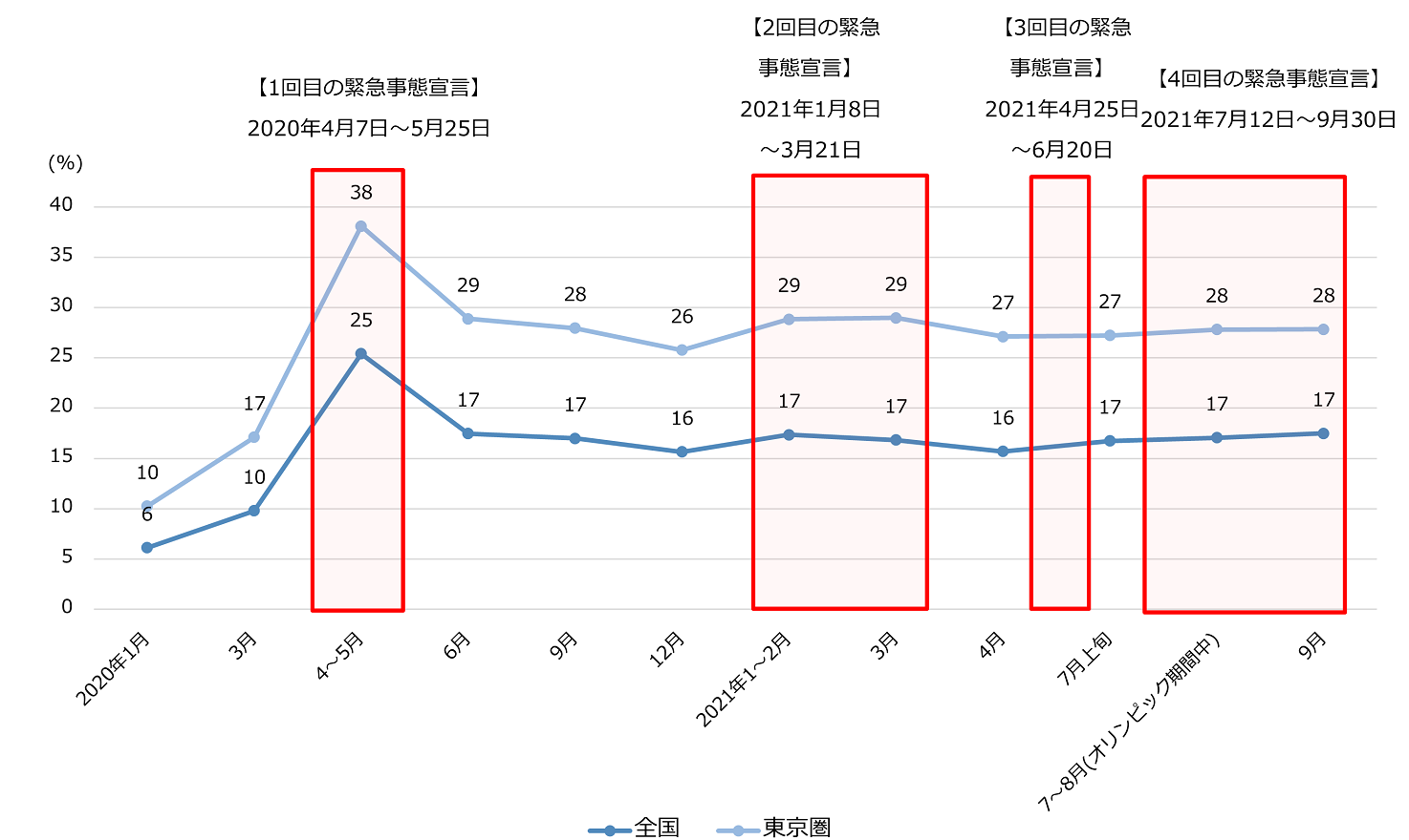 研究報告書 2021.10.07 第5回テレワークに関する就業者実態調査(速報) この記事は分で読めます シェア Tweet 大久保敏弘 慶應義塾大学経済学部教授 NIRA総合研究開発機構 最新の調査結果はこちら➡「第10回テレワーク調査」 概要 慶應義塾大学経済学部大久保敏弘研究室、(公財)NIRA総合研究開発機構では、「第5回テレワーク(注1)に関する就業者実態調査(注2)」を実施した。本調査は、新型コロナウイルスの感染拡大による、全国の就業者の働き方、生活、意識の変化や、業務への影響等の実態を捉えることを目的に実施したものである。調査は2021年9月4日(土)~22日(水)にかけて行われた。回収数は10,644件であり、うち過去の同調査からの継続回答は8,455件である。速報結果は以下のとおり。詳細版は2021年12月を目途に公表する予定である。 PDFで読む (2.5MB) INDEX 1. テレワーク利用率 2. 通常の職場での勤務とテレワークによる勤務の頻度 3. 仕事の効率の変化 4. ICTツールの活用状況 5. メンタルヘルス 6. 新型コロナウイルス感染 7. ワクチン接種 8. 新型コロナウイルスの感染や影響の予測 9. グリーン・ジョブ 調査概要 ポイント●2021年9月1週目時点の全国の就業者のテレワーク利用率は17%(東京圏28%)となった。2020年6月以降は、ほぼ同水準で推移している。2回目以降の緊急事態宣言発令中やオリンピック開催中も、テレワーク利用率に大きな変化はない。しかし、テレワーク利用頻度は緩やかに増加してきており、テレワークと出社を組み合わせた働き方のバランスが、全体としては、テレワークの比重が高い方向にシフトしている。●テレワークで仕事の効率が低下する要因として、仕事の特性上テレワークが困難であること、コミュニケーションの悪化、自宅環境に課題があることを回答する人の割合が高い。一方、テレワークで仕事の効率が上昇する要因として、疲労の軽減、仕事の特性上テレワークが向いていること、自宅環境の良さを回答する人の割合が高い。●ICTツールの活用状況は、2021年9月時点で、テレワーク利用者は85%である一方、テレワークを利用していない人は26%と、テレワーク利用者のICT利用率が顕著に高い。時系列の変化として、オフィス勤務者のICTツールの利用が広がっており、全体のICT利用率が徐々に上昇している。●新型コロナウイルスの感染経験のある人は、感染経験のない人よりも、メンタルヘルスが悪く、また、経済的な困窮への不安を感じている。また、ワクチンの接種状況に性別による差はないが、年齢が若いほど接種完了率が低い傾向にある。「接種しない」と回答した人の割合は年齢が若いほど大きく、10~20代では23%にのぼる。●自身の仕事がグリーン・ジョブに該当する人(一部が該当する人も含む)の割合は、就業者全体の31%であった。特に、環境問題への意識の向上や、リサイクルなどの活動が比較的行われている。グリーン・ジョブに携わる人が、仕事の中でグリーン・ジョブに費やす時間の割合は、10%と回答した人が最も多かった。 図表図表1 全国および東京圏のテレワーク利用率図表1-1 居住都道府県別でみたテレワーク利用率-新型コロナウイルス感染拡大前、第1回緊急事態宣言時、直近時点の比較-図表1-2-1 産業別でみたテレワーク利用率図表1-2-2 産業別(抜粋)でみたテレワーク利用率の推移図表1-3-1 所得階層別でみたテレワーク利用率図表1-3-2 所得階層別でみたテレワーク利用率の推移図表2-1 通常の職場で勤務している人の出社頻度図表2-2 テレワーク利用者の利用頻度図表3a 仕事の効率(2021年9月、テレワーク利用別)図表3b テレワーク利用者の仕事の効率の変化図表3-1 テレワークで仕事の効率が低下する要因図表3-2 テレワークで仕事の効率が上昇する要因図表4-1 ICTツールの活用状況(テレワーク利用別)図表4-2 ICTツールの活用状況図表4-3 目的別のICTツール活用状況(テレワーク利用別)図表4-4 個別ICTツールの活用状況(テレワーク利用別)図表5-1 2019年度国民生活基礎調査のK6の合計点の分布(12歳以上)図表5-2 2019年度国民生活基礎調査のK6の合計点の分布 有業人員(15歳以上)図表5-3 K6の分布図表5-4 性別、年齢階層別でみたK6の分布(2021年9月)図表6-1 新型コロナウイルスの感染経験とK6の分布図表6-2 新型コロナウイルスの感染経験と経済的な困窮への不安図表7 新型コロナワクチンの接種状況(2021年9月時点)図表8 新型コロナウイルスの感染や影響の予測図表9-1 グリーン・ジョブに携わっている人の割合図表9-2 グリーン・ジョブに携わっている人の割合(分類別)図表9-3 グリーン・ジョブに携わっている人の割合(産業別)図表9-4 グリーン・ジョブに費やす時間の割合(グリーンジョブに携わっている人のみ) 調査概要調査方法:インターネット調査(スクリーニング調査・本調査)。回収目標数を10,000サンプルとして、過去の調査と同様のスクリーニング調査、割付を行ったうえで、配信し、回収した。(注3)調査機関:株式会社日経リサーチ調査対象者:調査会社に登録しているインターネット調査登録モニター調査対