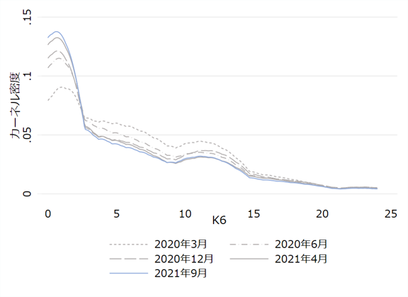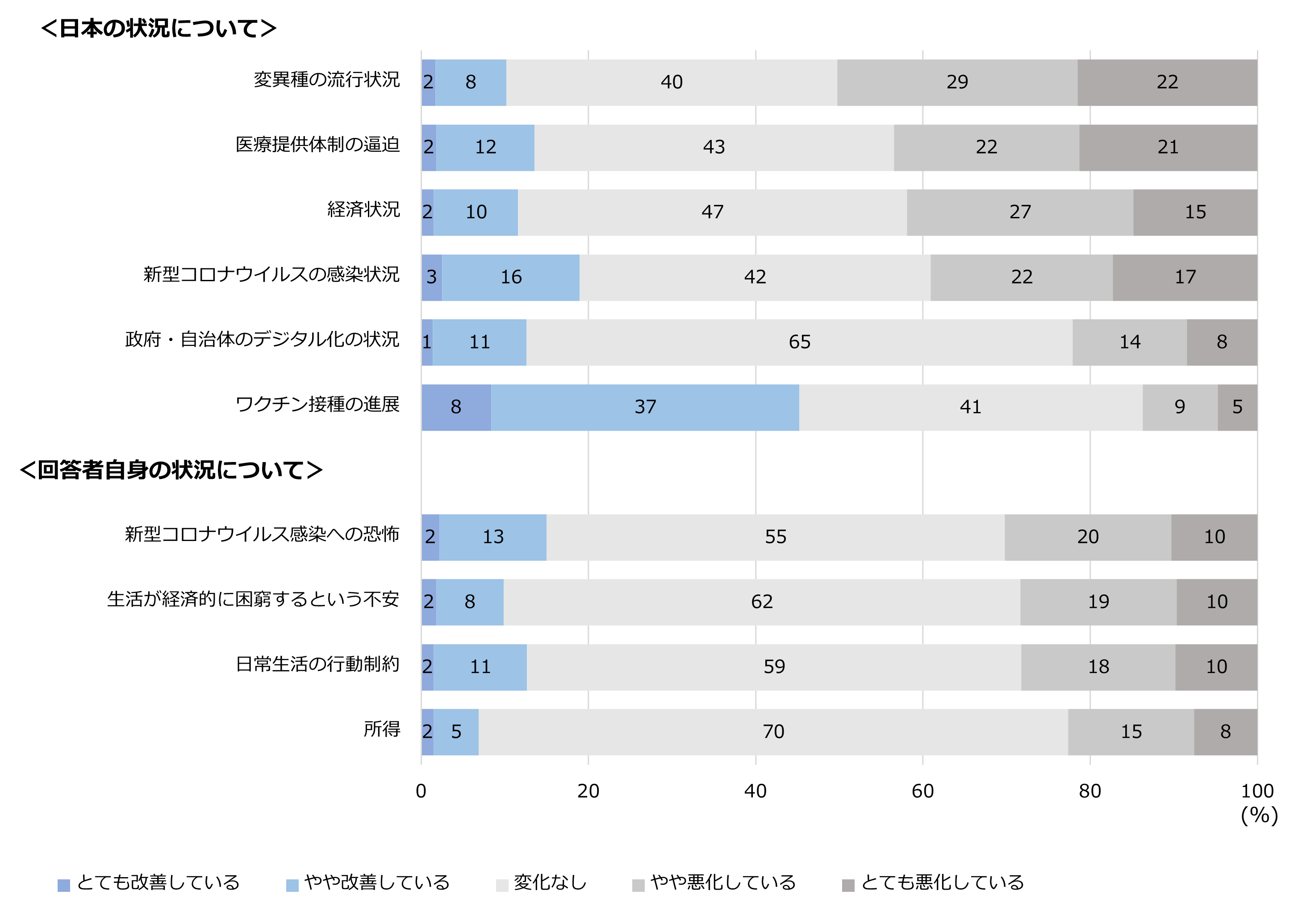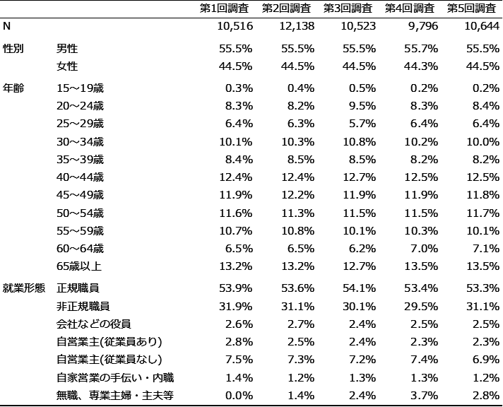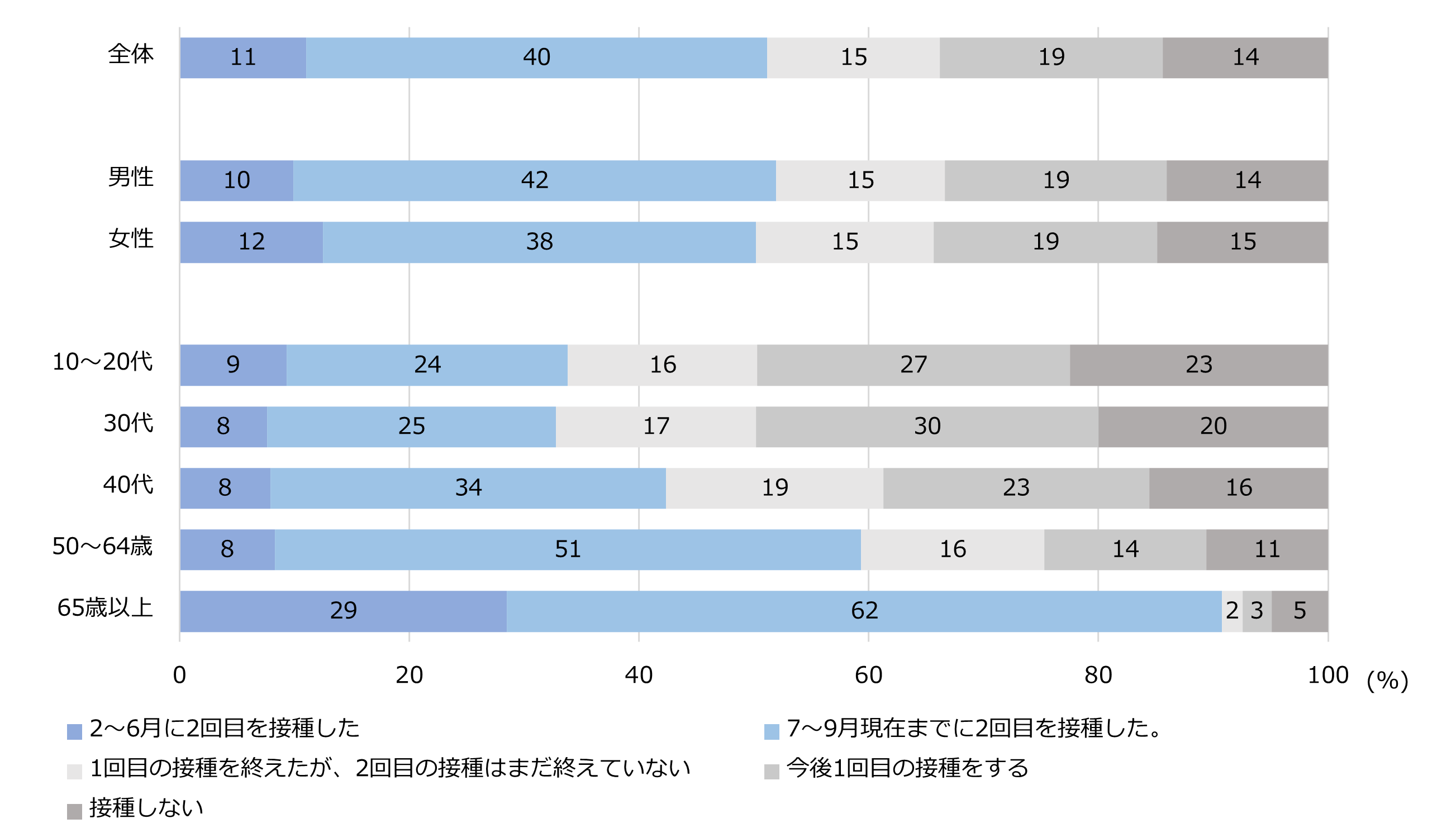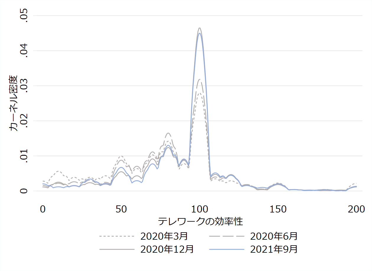 研究報告書 2021.10.07 第5回テレワークに関する就業者実態調査(速報) この記事は分で読めます シェア Tweet 大久保敏弘 慶應義塾大学経済学部教授 NIRA総合研究開発機構 最新の調査結果はこちら➡「第10回テレワーク調査」 概要 慶應義塾大学経済学部大久保敏弘研究室、(公財)NIRA総合研究開発機構では、「第5回テレワーク(注1)に関する就業者実態調査(注2)」を実施した。本調査は、新型コロナウイルスの感染拡大による、全国の就業者の働き方、生活、意識の変化や、業務への影響等の実態を捉えることを目的に実施したものである。調査は2021年9月4日(土)~22日(水)にかけて行われた。回収数は10,644件であり、うち過去の同調査からの継続回答は8,455件である。速報結果は以下のとおり。詳細版は2021年12月を目途に公表する予定である。 PDFで読む (2.5MB) INDEX 1. テレワーク利用率 2. 通常の職場での勤務とテレワークによる勤務の頻度 3. 仕事の効率の変化 4. ICTツールの活用状況 5. メンタルヘルス 6. 新型コロナウイルス感染 7. ワクチン接種 8. 新型コロナウイルスの感染や影響の予測 9. グリーン・ジョブ 調査概要 ポイント●2021年9月1週目時点の全国の就業者のテレワーク利用率は17%(東京圏28%)となった。2020年6月以降は、ほぼ同水準で推移している。2回目以降の緊急事態宣言発令中やオリンピック開催中も、テレワーク利用率に大きな変化はない。しかし、テレワーク利用頻度は緩やかに増加してきており、テレワークと出社を組み合わせた働き方のバランスが、全体としては、テレワークの比重が高い方向にシフトしている。●テレワークで仕事の効率が低下する要因として、仕事の特性上テレワークが困難であること、コミュニケーションの悪化、自宅環境に課題があることを回答する人の割合が高い。一方、テレワークで仕事の効率が上昇する要因として、疲労の軽減、仕事の特性上テレワークが向いていること、自宅環境の良さを回答する人の割合が高い。●ICTツールの活用状況は、2021年9月時点で、テレワーク利用者は85%である一方、テレワークを利用していない人は26%と、テレワーク利用者のICT利用率が顕著に高い。時系列の変化として、オフィス勤務者のICTツールの利用が広がっており、全体のICT利用率が徐々に上昇している。●新型コロナウイルスの感染経験のある人は、感染経験のない人よりも、メンタルヘルスが悪く、また、経済的な困窮への不安を感じている。また、ワクチンの接種状況に性別による差はないが、年齢が若いほど接種完了率が低い傾向にある。「接種しない」と回答した人の割合は年齢が若いほど大きく、10~20代では23%にのぼる。●自身の仕事がグリーン・ジョブに該当する人(一部が該当する人も含む)の割合は、就業者全体の31%であった。特に、環境問題への意識の向上や、リサイクルなどの活動が比較的行われている。グリーン・ジョブに携わる人が、仕事の中でグリーン・ジョブに費やす時間の割合は、10%と回答した人が最も多かった。 図表図表1 全国および東京圏のテレワーク利用率図表1-1 居住都道府県別でみたテレワーク利用率-新型コロナウイルス感染拡大前、第1回緊急事態宣言時、直近時点の比較-図表1-2-1 産業別でみたテレワーク利用率図表1-2-2 産業別(抜粋)でみたテレワーク利用率の推移図表1-3-1 所得階層別でみたテレワーク利用率図表1-3-2 所得階層別でみたテレワーク利用率の推移図表2-1 通常の職場で勤務している人の出社頻度図表2-2 テレワーク利用者の利用頻度図表3a 仕事の効率(2021年9月、テレワーク利用別)図表3b テレワーク利用者の仕事の効率の変化図表3-1 テレワークで仕事の効率が低下する要因図表3-2 テレワークで仕事の効率が上昇する要因図表4-1 ICTツールの活用状況(テレワーク利用別)図表4-2 ICTツールの活用状況図表4-3 目的別のICTツール活用状況(テレワーク利用別)図表4-4 個別ICTツールの活用状況(テレワーク利用別)図表5-1 2019年度国民生活基礎調査のK6の合計点の分布(12歳以上)図表5-2 2019年度国民生活基礎調査のK6の合計点の分布 有業人員(15歳以上)図表5-3 K6の分布図表5-4 性別、年齢階層別でみたK6の分布(2021年9月)図表6-1 新型コロナウイルスの感染経験とK6の分布図表6-2 新型コロナウイルスの感染経験と経済的な困窮への不安図表7 新型コロナワクチンの接種状況(2021年9月時点)図表8 新型コロナウイルスの感染や影響の予測図表9-1 グリーン・ジョブに携わっている人の割合図表9-2 グリーン・ジョブに携わっている人の割合(分類別)図表9-3 グリーン・ジョブに携わっている人の割合(産業別)図表9-4 グリーン・ジョブに費やす時間の割合(グリーンジョブに携わっている人のみ) 調査概要調査方法:インターネット調査(スクリーニング調査・本調査)。回収目標数を10,000サンプルとして、過去の調査と同様のスクリーニング調査、割付を行ったうえで、配信し、回収した。(注3)調査機関:株式会社日経リサーチ調査対象者:調査会社に登録しているインターネット調査登録モニター調査対