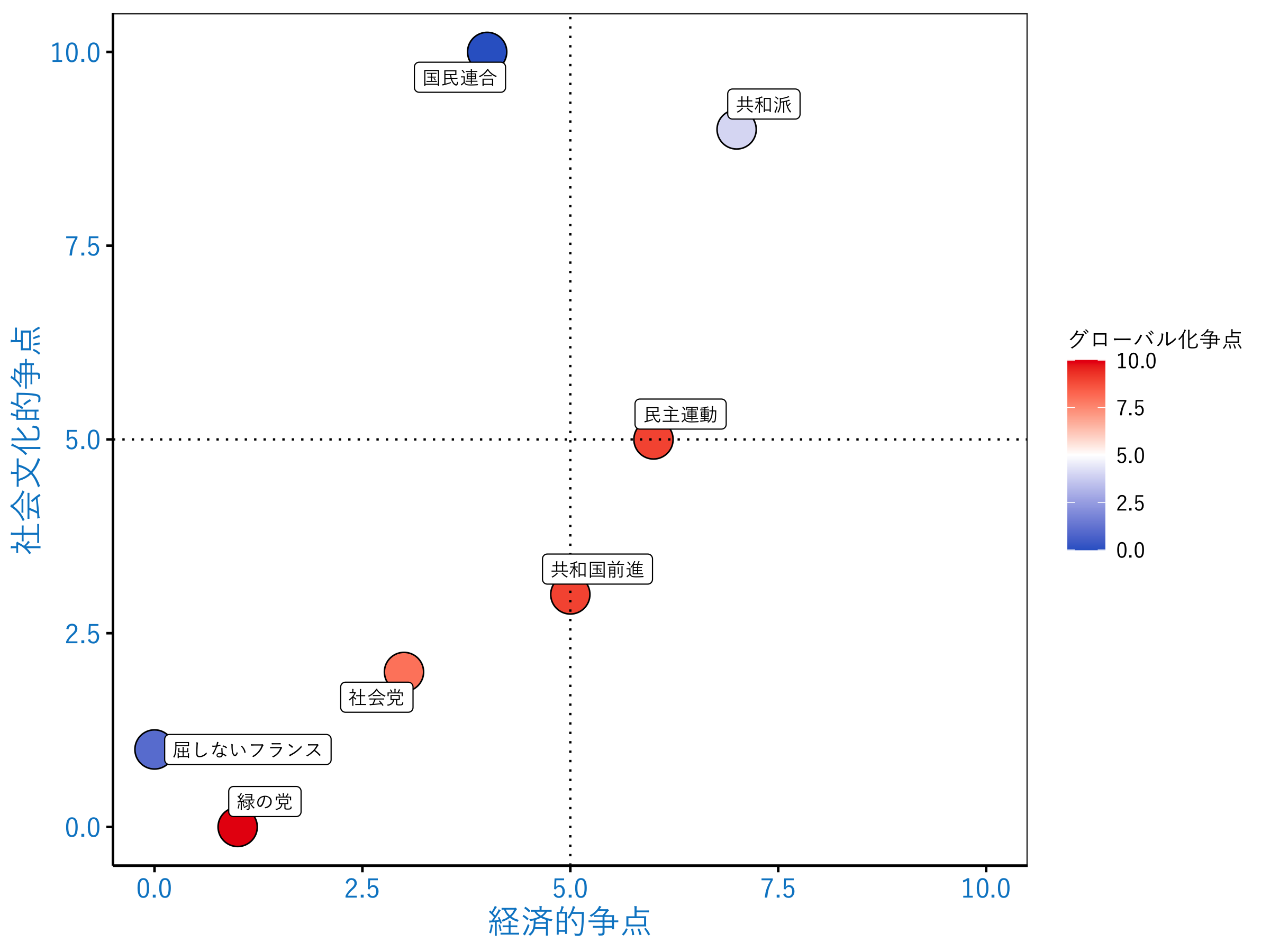English version 研究報告書 2021.08.27 経済・社会文化・グローバリゼーションー第1章 フランスー この記事は分で読めます シェア Tweet 吉田徹 同志社大学政策学部教授 概要 フランス政治は、1970年代には保革対立、そして80年代以降には「大きな政府と小さな政府」の対立が、左右の既存政党を中心に展開していた。だが、90年代以降の欧州統合めぐる問題では、保革政党内での対立から反欧州統合勢力が離党し、多党化を招いた。その結果、政党間の対立は、それまでの経済的争点から、移民や治安からなる社会文化的争点やグローバリズムに関する争点へと移行した。 こうした政治的対立ならびに92年と2005年の2度に渡る国民投票から、フランスでは「有権者市場の3分割化」が生じた。左右既成政党に包括されない「下」の有権者からの支持を獲得したのが、右派ポピュリスト政党の国民連合(旧国民戦線)である。他方で、左派側では、「屈しないフランス」が、やはり反グローバリズムを前面に打ち出し、若年層や高学歴層から支持を得て、左派陣営内での地位を固めた。こうした左右ポピュリスト政党の支持拡大は、反グローバリズムの主張を支持する有権者が一定程度いることを示している。 中道与党の共和国前進は、こうした反グローバル勢力に対して明確に親EU、親グローバル化の方針をとっている。国民連合が既存の右派勢力との協力関係を構築できない以上、既存の保革勢力に対して優位に立つことができるためである。今後、マクロン率いる共和国前進は、グローバル化によって没落しつつある中間層を積極的な支持層に変えられるかがポイントとなる。一方で、黄色いベスト運動やヨーロッパ全体に広がる緑の党の支持拡大など、既成政党や左右ポピュリスト政党ですら代表できない有権者層の出現は、更なる政治的な変化の予兆を示唆している。経済・社会文化・グローバリゼーション・総論 2020年の各国政党政治・第1章 フランス ・第2章 イギリス ・第3章 ドイツ ・第4章 イタリア ・第5章 オランダ ・第6章 スペイン ・第7章 北欧諸国 ・第8章 アメリカ ・第9章 韓国 PDFで読む (1.3MB) General Introduction & Country Summaries (623.1KB) INDEX 第1章 フランス 中道連合の与党と、対抗勢力としての両極の政党 社会文化的争点の重要性の高まりとグローバル化への立場 極右から変容した国民連合 既成政党を割って出た「屈しないフランス」 左右のポピュリスト政党の勢力拡大をもたらした反グローバリズム 有権者市場の3分割によるポピュリズム政党の勢力拡大 既成保守政党の右派ポピュリスト政党化への反発 消極的な支持を受けたマクロンと新型コロナ 既成政党のリベラル化による中間層の凋落 どの政党にも代表されることのない新しい層 第1章 フランス 中道連合の与党と、対抗勢力としての両極の政党 フランスの主要政党は7つある。最大与党は、マクロン大統領が2017年の大統領選に際に結成した「共和国前進」である。さらにキリスト教民主党の流れをくみ、1974年から1期だけ大統領を務めたジスカール・デスタンがつくった中道右派政党であるUDF(The Union for French Democracy)と、中道諸派の連合体の2つが統合して生まれた中道政党の「民主運動(MoDem)」がある。この「共和国前進」と「民主運動」が連立を組んでいるのが、現在のフランスの与党である。 これに対する有力な対抗勢力(オルタナティブ)は、「国民連合(RN)」である。マリーヌ・ル・ペンが率いる国民連合は、かつては、国民戦線(FN)という名称で、極右政党と見なされていた。2017年の大統領選後に改称し、現在は右派ポピュリスト政党とみられている。国民連合が有力なオルタナティブであることは、2017年の大統領選で、マリーヌ・ル・ペンが、第1回投票で2位につけ、決選投票に進んだことからも理解できる。 また、左派側の既成政党の社会民主主義の立場をとっていた政党が中道化したことで、左派のポジションに取って代わったのが、「屈しないフランス」とも呼ばれるフランス・アンスニーズ(LFI)である。LFIは、社会党から分派をした党首メランションが共産党と組むことでつくった極左政党であり、ドイツのDie Linke(左派党)と似たように、既成の左派政党が取りこぼした左派層を獲得することで勢力を拡大しつつある。 その他にも、フランス政治の中心的な存在であった保守政党であるLR(共和派・共和党、かつてのRPR、UMP)や、同じく左派側の政党である社会党がある。この2つの政党は、歴史的に大きな勢力を得ていた左右の既成政党である。また、注目を浴びつつあるのが、環境政党である緑の党である。 これら政党を、経済争点、及び社会文化争点の2軸で位置づけると、図のようになる。その中で、特徴的なのは、共和国前進である。中道に位置する共和国前進は、当初のアピール対象として右派傾向の支持層を想定して政策を掲げ、そこから徐々に左派傾向の支持層を想定して政策を行うなどすることで、中道の包括政党として、政策のウイングを広げ、支