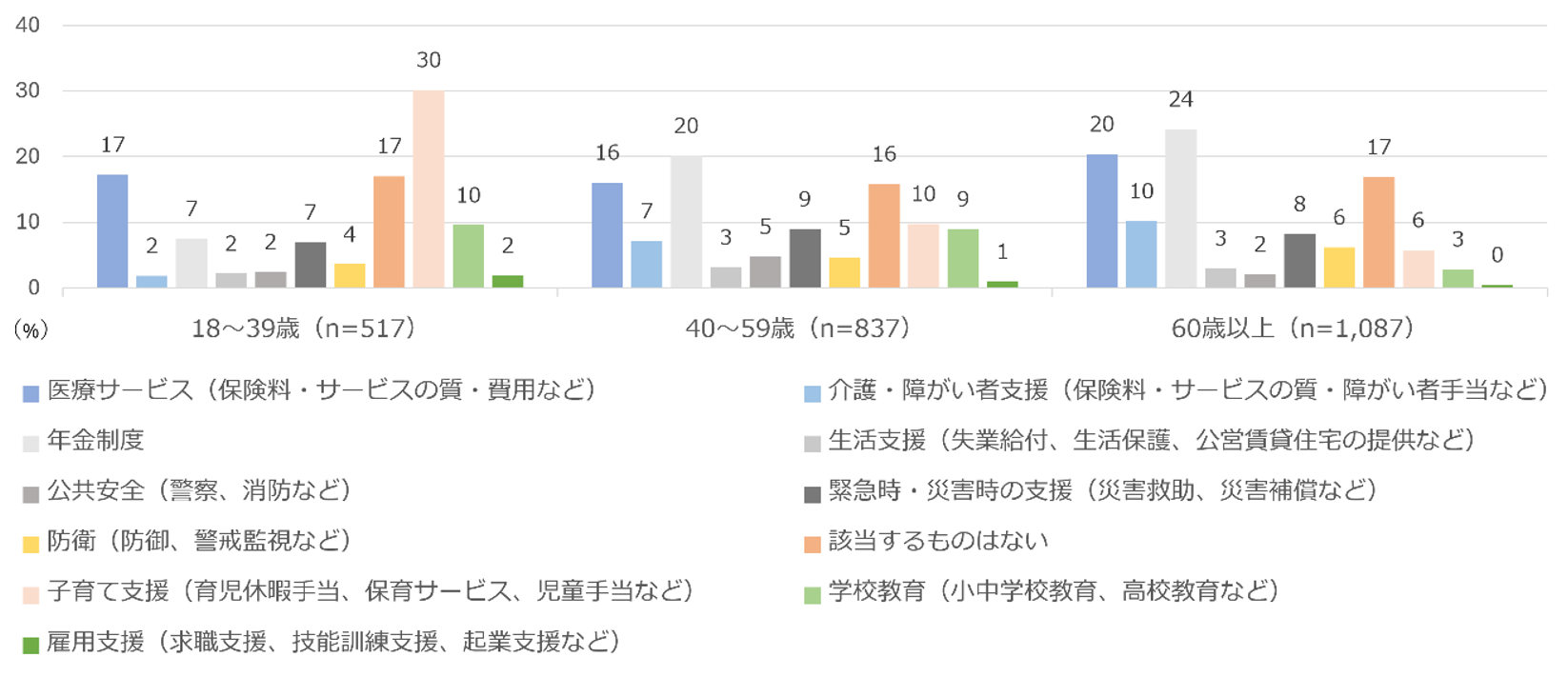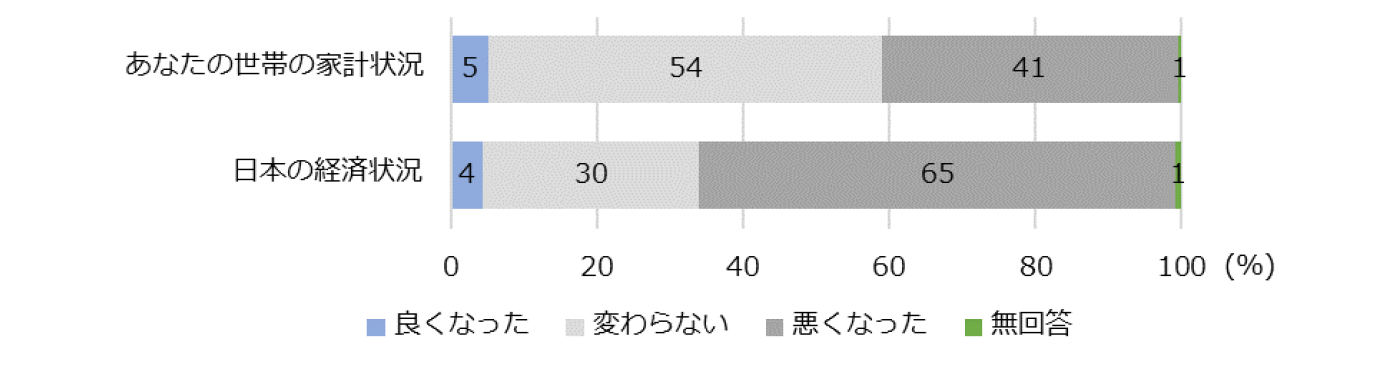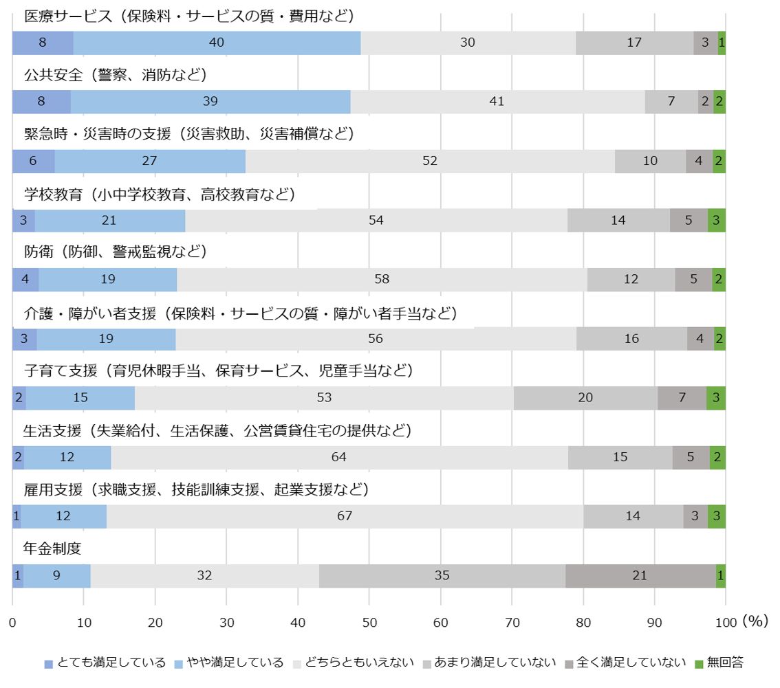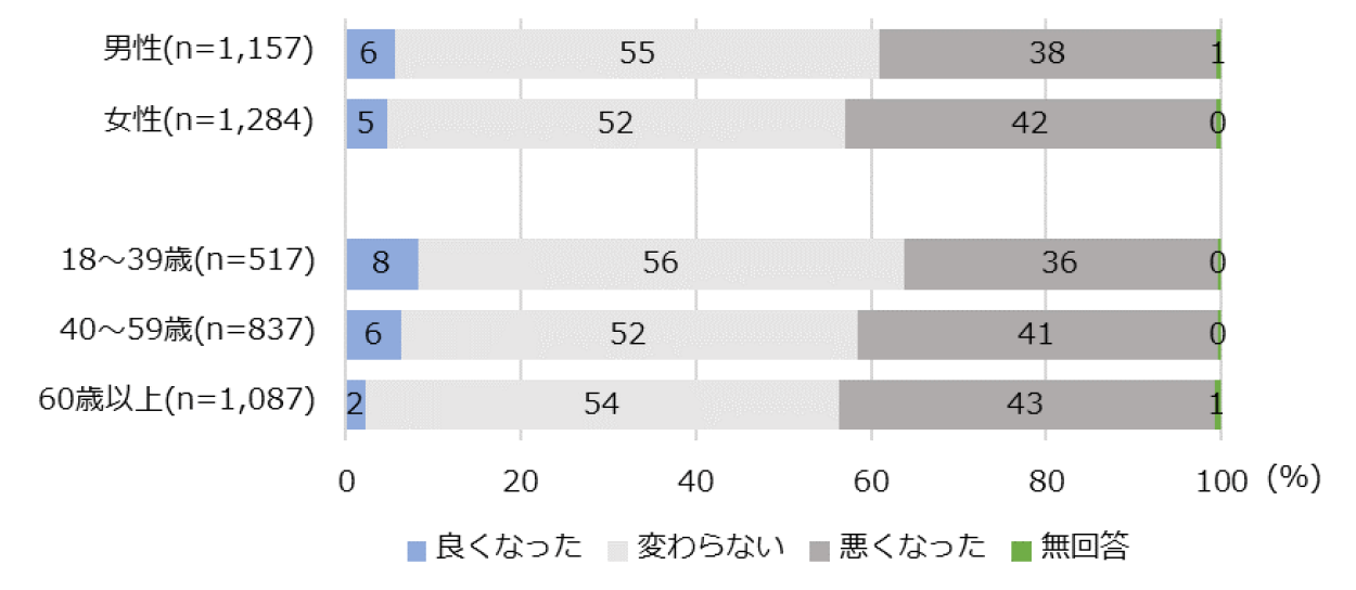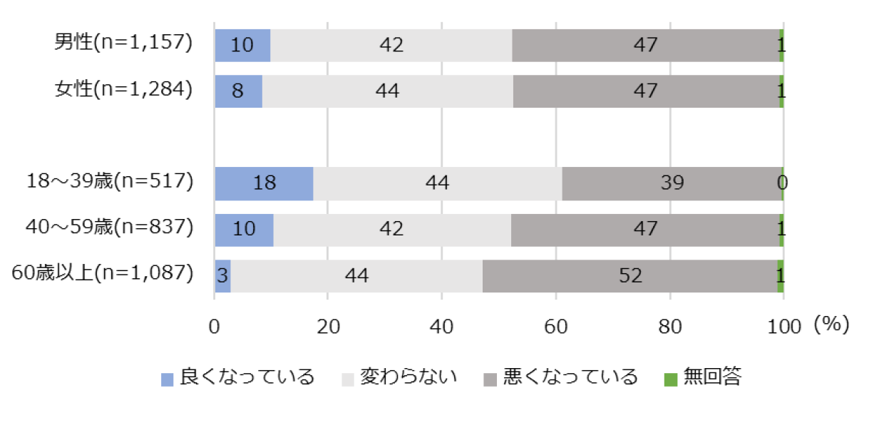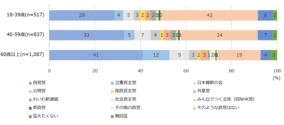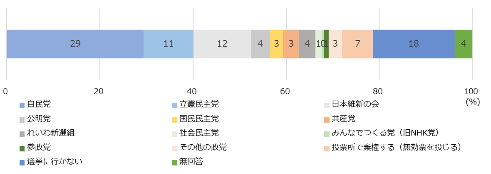 研究報告書 2024.04.26 第2回政治・経済・社会に関する意識調査(NIRA基本調査)(速報) この記事は分で読めます シェア Tweet NIRA総合研究開発機構 最新の調査結果はこちら➡「第3回政治・経済・社会に関する意識調査」 概要 (公財)NIRA総合研究開発機構では、「第2回政治・経済・社会に関する意識調査(NIRA基本調査)」を実施した。本調査は政治・経済・社会に関連する人々の意識を定点観測することを目的としている。今回の調査は昨年に続く第2回目となる。前回は、性別・年齢・居住地域で回収目標数を割り付けたインターネット調査を実施したのに対して、今回は、層化2段無作為抽出に基づく面接調査を主たる調査とし、面接調査を補完するため、面接調査と同一の調査項目、かつ全く同じタイミングで、インターネットでの調査を行った。 この速報は、面接調査について、すべての設問の単純集計と一部の設問についてのクロス集計の結果をまとめたものである(インターネット調査の結果については、後日報告する予定)。 本面接調査は2024年1月19日(金)~2024年2月4日(日)にかけて行われ、回収数は2,441であった。この速報で示されている数値は、すべてウエイトによる補正をしたものである。「国勢調査(2020年)」の18歳以上の日本人を母集団とみなして、性別、年齢(18~39歳、40~59歳、60歳以上の3段階)、都市規模(21大都市に居住しているか否か)の3属性で、レイキング法によって補正した。また、この速報のグラフ中の数字はすべて四捨五入したものである。そのため、グラフ中の数字の合計が100%にならなかったり、本文中の数字と一致しなかったりすることがある。 速報を読む(2024年4月26公表) (2.7MB) INDEX Ⅰ 調査結果 1.政治分野 1.1.投票予定政党と長期的党派性 1.2.諸外国への親近感 1.3.組織などへの信頼度と理由 1.4.政治的有効性感覚・ポピュリズム態度 2.経済分野 2.1.世帯の家計状況、日本の経済状況の変化 2.2.世帯の家計状況、日本の経済状況の見通し 2.3.個人を取り巻く状況への見通し 2.4.日本社会を取り巻く状況への見通し 2.5.デジタル化や技術革新の影響に関する認識 2.6.生活時間 2.7.情報メディア 2.8.地域、ボランティア、副業に関する活動状況 2.9.環境に配慮した活動 3.社会分野 3.1.社会に対する考え方 3.2.公的サービスに対する考え方 3.3.人々の社会意識 Ⅱ 調査概要 1.調査の趣旨・目的 2.調査名 3.主な調査項目 4.調査期間 5.調査方法 6.回収数 7.本報告書の集計方法 8.研究体制 ポイント●長期的党派性として、自民党を支持すると答えた人は全体の35%であり、立憲民主党と日本維新の会(いずれも7%)がそれに続く。「そのような政党はない」と答えた人は全体の30%であった。●政治家を「非常に信頼する」あるいは「信頼する」と回答した人は、全体の20%程度にとどまった。政治家を信頼する層としない層では、自民党を支持する人の割合がそれぞれ56%と30%と、大きな差があった。●「いまの政党や政治家は腐敗しており敵をやっつける強い指導者が必要だ」という質問に「そう思う」あるいは「どちらかといえばそう思う」と答えた人は全体の54%に及んでおり、その背後にはポピュリズム的な態度があると推察される。●5~10年後の経済状況について悲観視する人が多く、世帯の家計状況が「悪くなっている」と回答した人の割合は50%近くになり、日本の経済状況が「悪くなっている」と回答した人の割合は60%近い。●日本社会を取り巻く状況への見通しや、デジタル化や技術革新がもたらす影響について、全体的にネガティブな回答が多い。例えば、異常気象や大規模災害の発生、物価上昇による生活苦については、80%を超える人が起こりそうという認識を持っている。●情報メディアについては、若年層ほどSNS、高齢層ほどテレビへの接触時間が長い。若年層は、SNSへの信頼がない人でも、メディア接触時間としてSNSが最も長い人は半数を上回る。●理想の日本社会について尋ねたところ、自由に競争し、成果に応じて分配される社会を支持する人が多く、割合は49%となった。一方で、税を負担しても福祉などの行政サービスを充実させ、行政機関による規制を通じて人びとの生活の安全と経済の安定を守る社会を理想とする声も、それぞれ半数程度あった。公共と個人の利益のどちらを優先させるかという質問については、「どちらともいえない」と答える人が最も多く59%だった。●公的サービスの内容について、最も多くの人が理解していた項目は、医療サービス(47%)と年金制度(45%)だったが、「公的サービスの満足度」を尋ねる質問では、医療サービスへの満足度が高いことに比べ、年金制度の満足度は著しく低い結果となった。●公的サービスの質や給付を充実させるために、自身の税・社会保険料の負担が増えてもよいものを聞いたところ、最も優先度の高い項目として、年齢別で18歳から30代は「子育て支援」、40代以上は「年金」を選ぶ人が多かった。●国や自治体のサービスで、無駄な支出が少ないと思っている人が最も