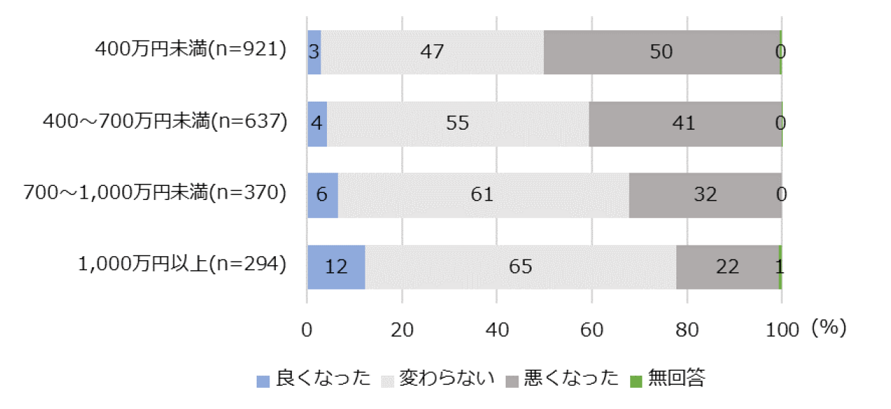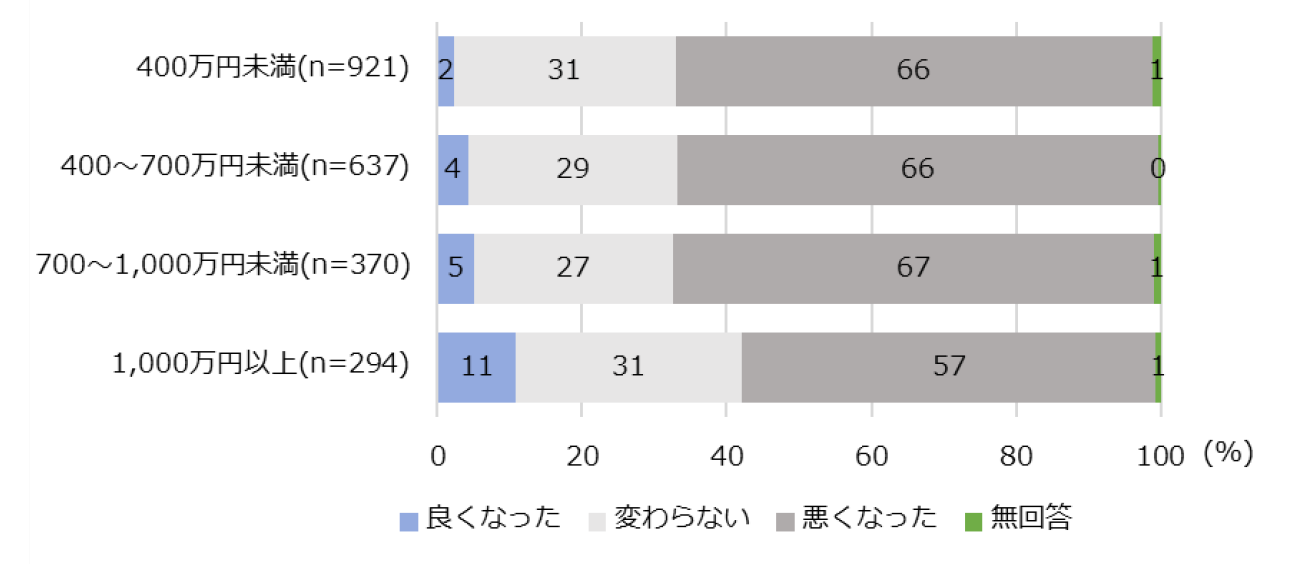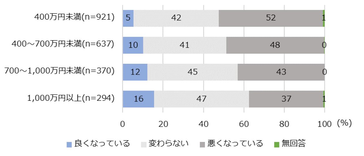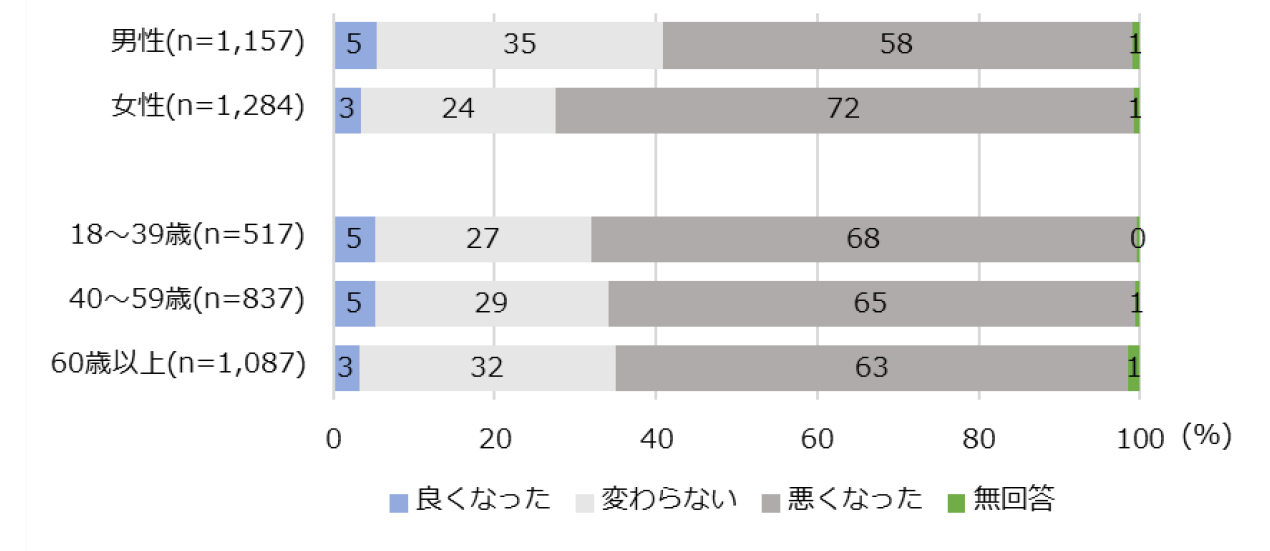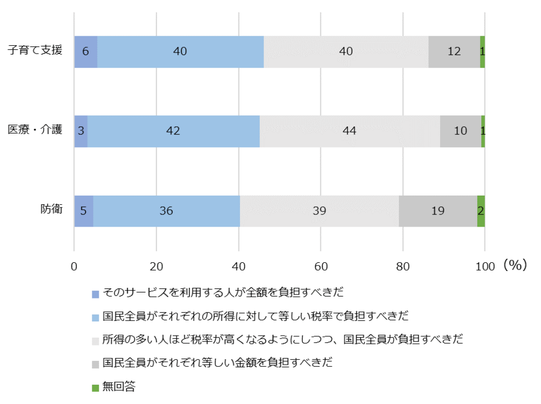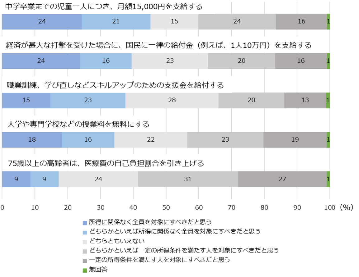 研究報告書 2024.04.26 第2回政治・経済・社会に関する意識調査(NIRA基本調査)(速報) この記事は分で読めます シェア Tweet NIRA総合研究開発機構 最新の調査結果はこちら➡「第3回政治・経済・社会に関する意識調査」 概要 (公財)NIRA総合研究開発機構では、「第2回政治・経済・社会に関する意識調査(NIRA基本調査)」を実施した。本調査は政治・経済・社会に関連する人々の意識を定点観測することを目的としている。今回の調査は昨年に続く第2回目となる。前回は、性別・年齢・居住地域で回収目標数を割り付けたインターネット調査を実施したのに対して、今回は、層化2段無作為抽出に基づく面接調査を主たる調査とし、面接調査を補完するため、面接調査と同一の調査項目、かつ全く同じタイミングで、インターネットでの調査を行った。 この速報は、面接調査について、すべての設問の単純集計と一部の設問についてのクロス集計の結果をまとめたものである(インターネット調査の結果については、後日報告する予定)。 本面接調査は2024年1月19日(金)~2024年2月4日(日)にかけて行われ、回収数は2,441であった。この速報で示されている数値は、すべてウエイトによる補正をしたものである。「国勢調査(2020年)」の18歳以上の日本人を母集団とみなして、性別、年齢(18~39歳、40~59歳、60歳以上の3段階)、都市規模(21大都市に居住しているか否か)の3属性で、レイキング法によって補正した。また、この速報のグラフ中の数字はすべて四捨五入したものである。そのため、グラフ中の数字の合計が100%にならなかったり、本文中の数字と一致しなかったりすることがある。 速報を読む(2024年4月26公表) (2.7MB) INDEX Ⅰ 調査結果 1.政治分野 1.1.投票予定政党と長期的党派性 1.2.諸外国への親近感 1.3.組織などへの信頼度と理由 1.4.政治的有効性感覚・ポピュリズム態度 2.経済分野 2.1.世帯の家計状況、日本の経済状況の変化 2.2.世帯の家計状況、日本の経済状況の見通し 2.3.個人を取り巻く状況への見通し 2.4.日本社会を取り巻く状況への見通し 2.5.デジタル化や技術革新の影響に関する認識 2.6.生活時間 2.7.情報メディア 2.8.地域、ボランティア、副業に関する活動状況 2.9.環境に配慮した活動 3.社会分野 3.1.社会に対する考え方 3.2.公的サービスに対する考え方 3.3.人々の社会意識 Ⅱ 調査概要 1.調査の趣旨・目的 2.調査名 3.主な調査項目 4.調査期間 5.調査方法 6.回収数 7.本報告書の集計方法 8.研究体制 ポイント●長期的党派性として、自民党を支持すると答えた人は全体の35%であり、立憲民主党と日本維新の会(いずれも7%)がそれに続く。「そのような政党はない」と答えた人は全体の30%であった。●政治家を「非常に信頼する」あるいは「信頼する」と回答した人は、全体の20%程度にとどまった。政治家を信頼する層としない層では、自民党を支持する人の割合がそれぞれ56%と30%と、大きな差があった。●「いまの政党や政治家は腐敗しており敵をやっつける強い指導者が必要だ」という質問に「そう思う」あるいは「どちらかといえばそう思う」と答えた人は全体の54%に及んでおり、その背後にはポピュリズム的な態度があると推察される。●5~10年後の経済状況について悲観視する人が多く、世帯の家計状況が「悪くなっている」と回答した人の割合は50%近くになり、日本の経済状況が「悪くなっている」と回答した人の割合は60%近い。●日本社会を取り巻く状況への見通しや、デジタル化や技術革新がもたらす影響について、全体的にネガティブな回答が多い。例えば、異常気象や大規模災害の発生、物価上昇による生活苦については、80%を超える人が起こりそうという認識を持っている。●情報メディアについては、若年層ほどSNS、高齢層ほどテレビへの接触時間が長い。若年層は、SNSへの信頼がない人でも、メディア接触時間としてSNSが最も長い人は半数を上回る。●理想の日本社会について尋ねたところ、自由に競争し、成果に応じて分配される社会を支持する人が多く、割合は49%となった。一方で、税を負担しても福祉などの行政サービスを充実させ、行政機関による規制を通じて人びとの生活の安全と経済の安定を守る社会を理想とする声も、それぞれ半数程度あった。公共と個人の利益のどちらを優先させるかという質問については、「どちらともいえない」と答える人が最も多く59%だった。●公的サービスの内容について、最も多くの人が理解していた項目は、医療サービス(47%)と年金制度(45%)だったが、「公的サービスの満足度」を尋ねる質問では、医療サービスへの満足度が高いことに比べ、年金制度の満足度は著しく低い結果となった。●公的サービスの質や給付を充実させるために、自身の税・社会保険料の負担が増えてもよいものを聞いたところ、最も優先度の高い項目として、年齢別で18歳から30代は「子育て支援」、40代以上は「年金」を選ぶ人が多かった。●国や自治体のサービスで、無駄な支出が少ないと思っている人が最も
